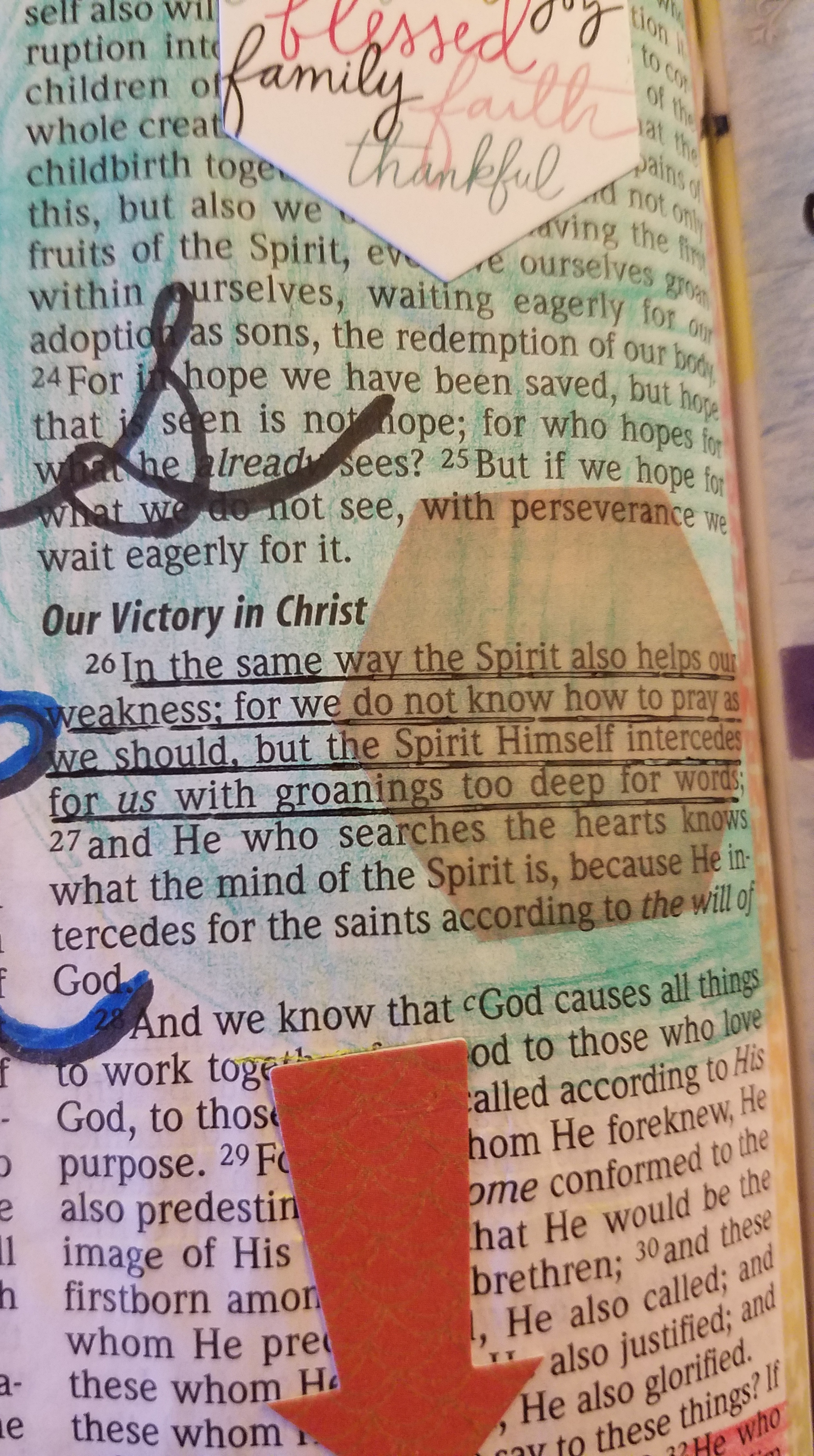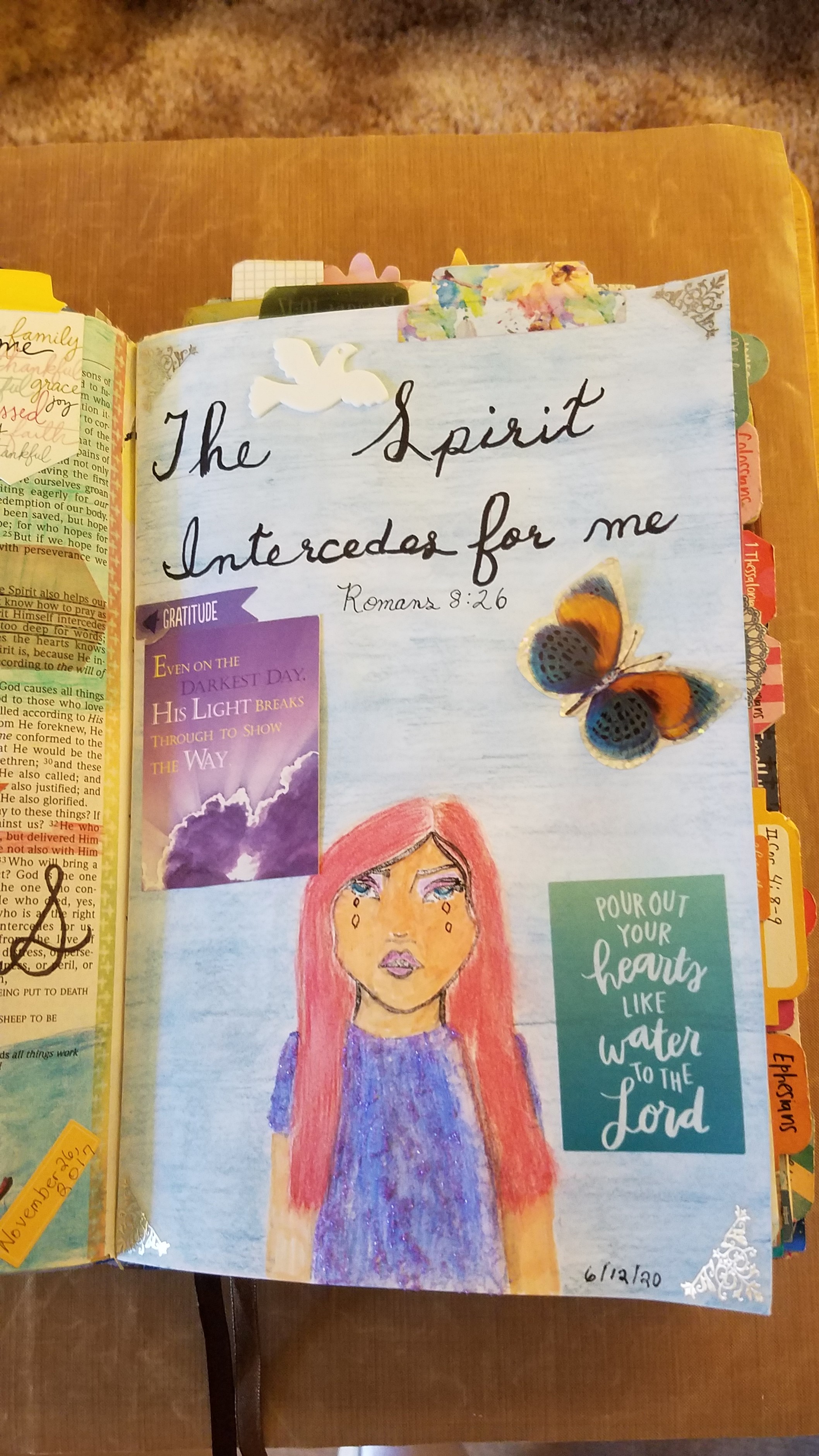Today’s Bible Journaling is from Romans 8:26, “In the same way the Spirit also helps our weakness; for we do not know how to pray as we should, but the Spirit Himself intercedes for us with groanings too deep for words.” (NASB) One of the functions of the Holy Spirit is to intercede for us.