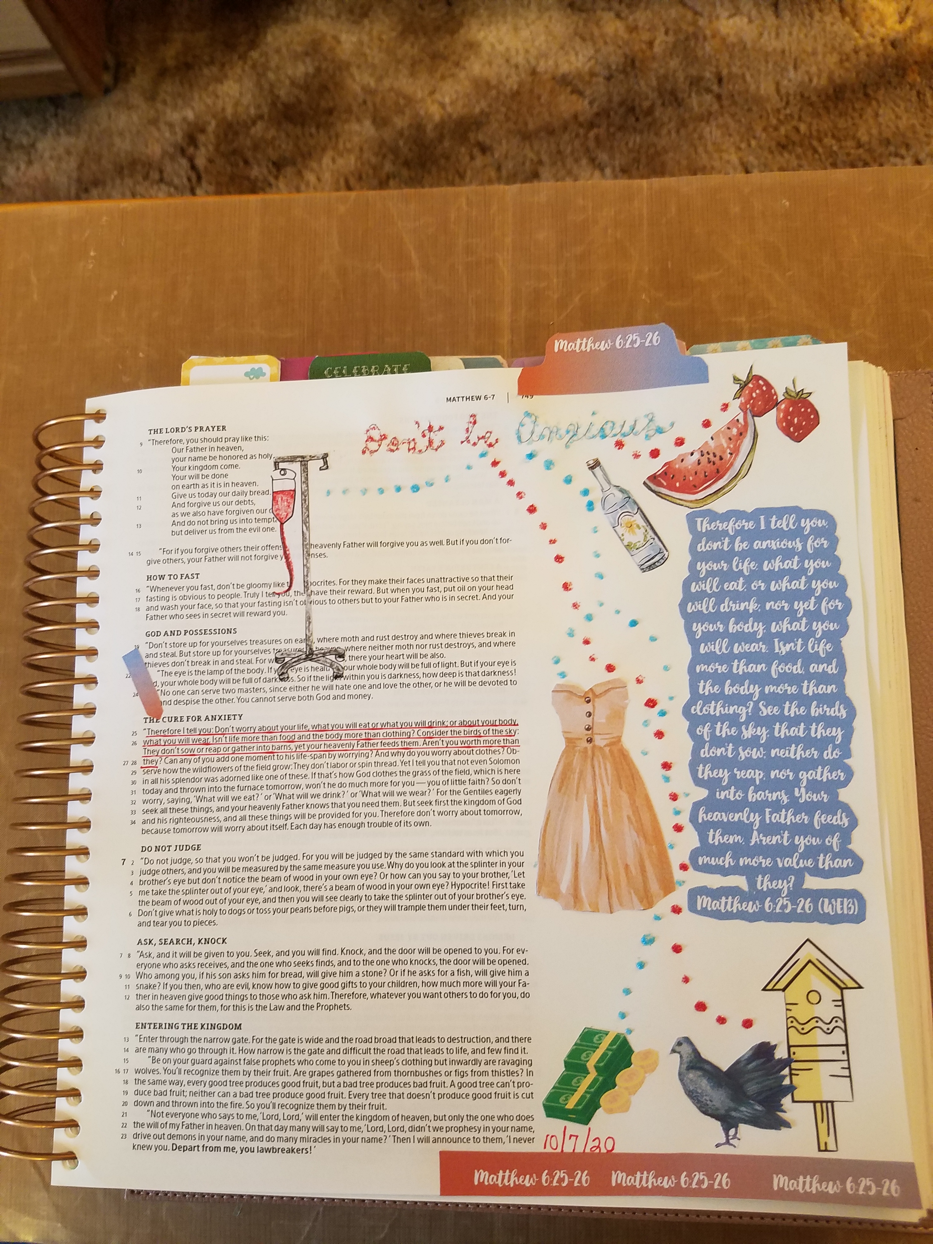 As we continue looking into how we can conquer fear and anxiety in our lives, we look at today’s Bible Journaling Scripture, Matthew 6:25-26, “Therefore I tell you: Don’t worry about your life, what you will eat or what you will drink; or about your body, what you will wear. Isn’t life more than food and the body more than clothing? Consider the birds of the sky: They don’t sow or reap or gather into barns, yet your heavenly Father feeds them. Aren’t you worth more than they?” (CSB) We are surrounded today by fear from every side.  Fear of getting a virus we can’t see, fear of death, fear of financial ruin, fear of not being able to put food on the table, fear that we may not have enough clothes, or that we may lose our house to foreclosure.  So many things that can cause us to be filled with anxiety and fear.