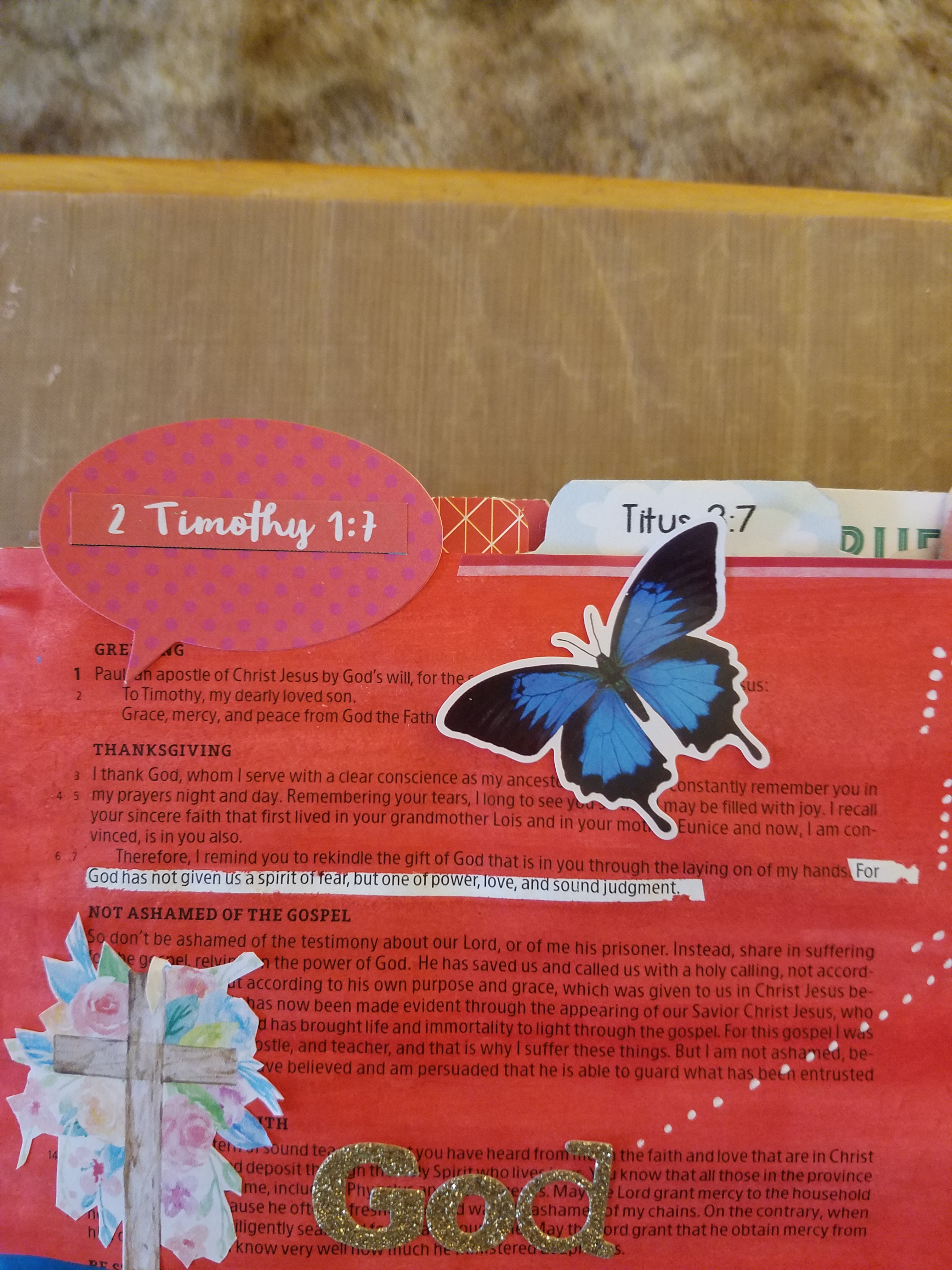 Today’s Bible Journaling Scripture is very familiar to Believers, 2 Timothy 1:7 says, “For God has not given us a spirit of fear, but one of power, love, and sound judgment.” (CSB) The King James Version says, “a sound mind.” I decided to investigate some commentaries to get some thoughts from Bible scholars of note.