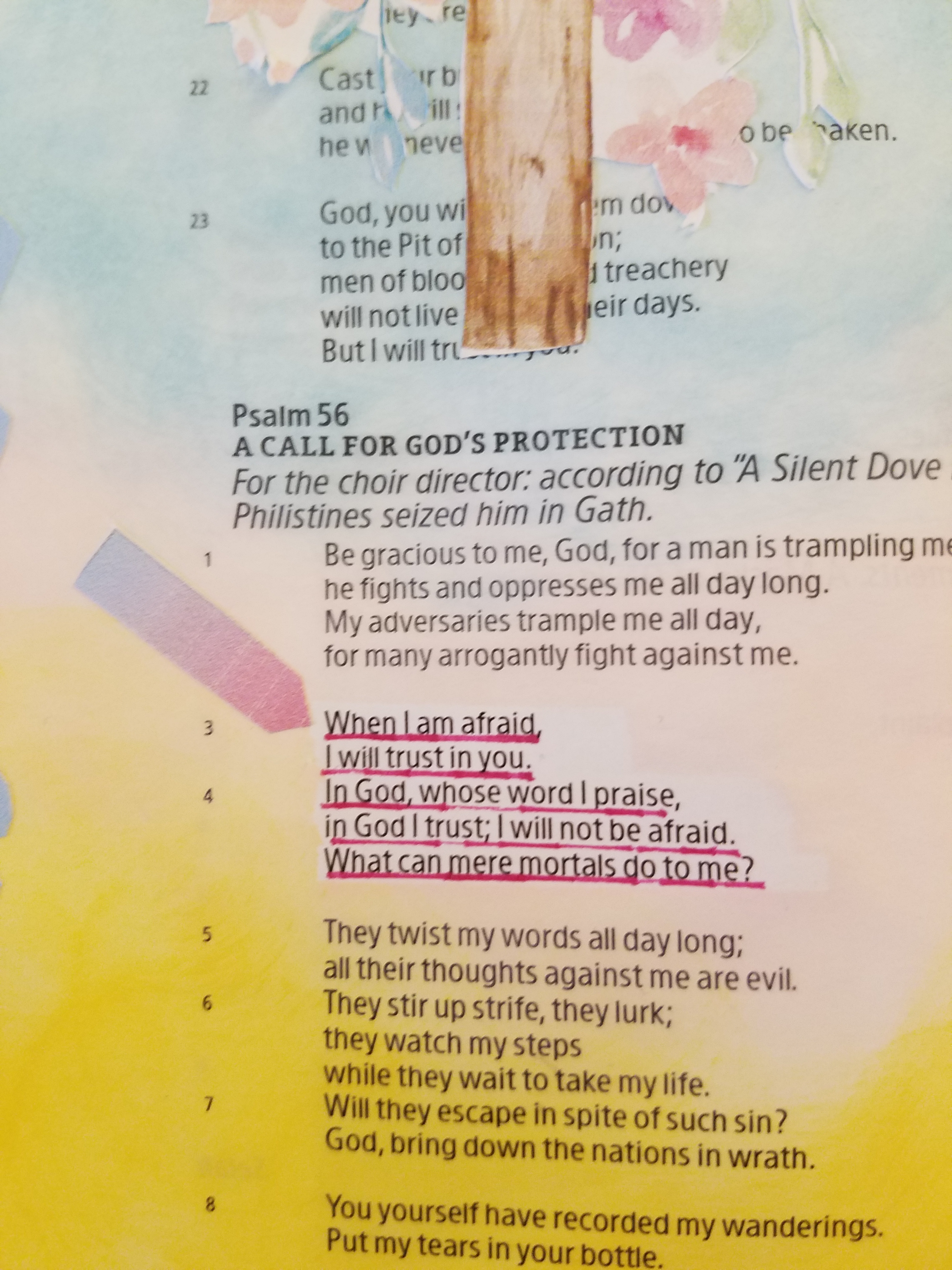 As we continue to look at fear, our Scripture for today is Psalm 56:3-4, “When I am afraid, I will trust in you. In God, whose word I praise, in God I trust; I will not be afraid. What can mere mortals do to me?” (CSB) David is expressing his trust in God and that he is not fearful. According to the notes in my Bible, David wrote this when the Philistines had captured him in Gath. He is in the hands of the enemy, yet he is not fearful!
