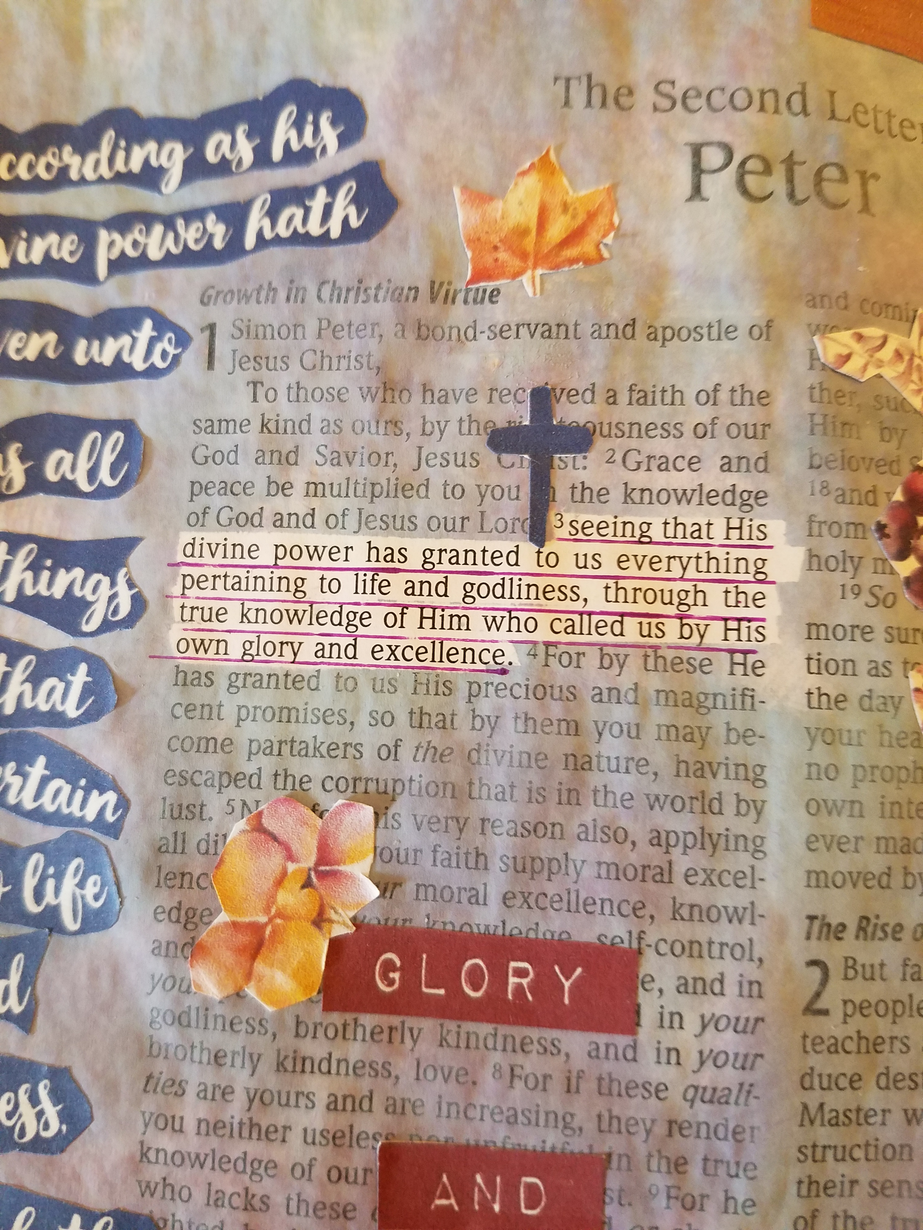 Today’s Bible Journaling Scripture is 2 Peter 1:3, “seeing that His divine power has granted to us everything pertaining to life and godliness, through the true knowledge of Him who called us by His own glory and excellence.” (NASB 1995) What seemed to stand out to me when I read this was that God has given us “everything pertaining to life and godliness.” As I was thinking about this, God impressed upon my heart that this is the abundance we have been speaking about in this series.