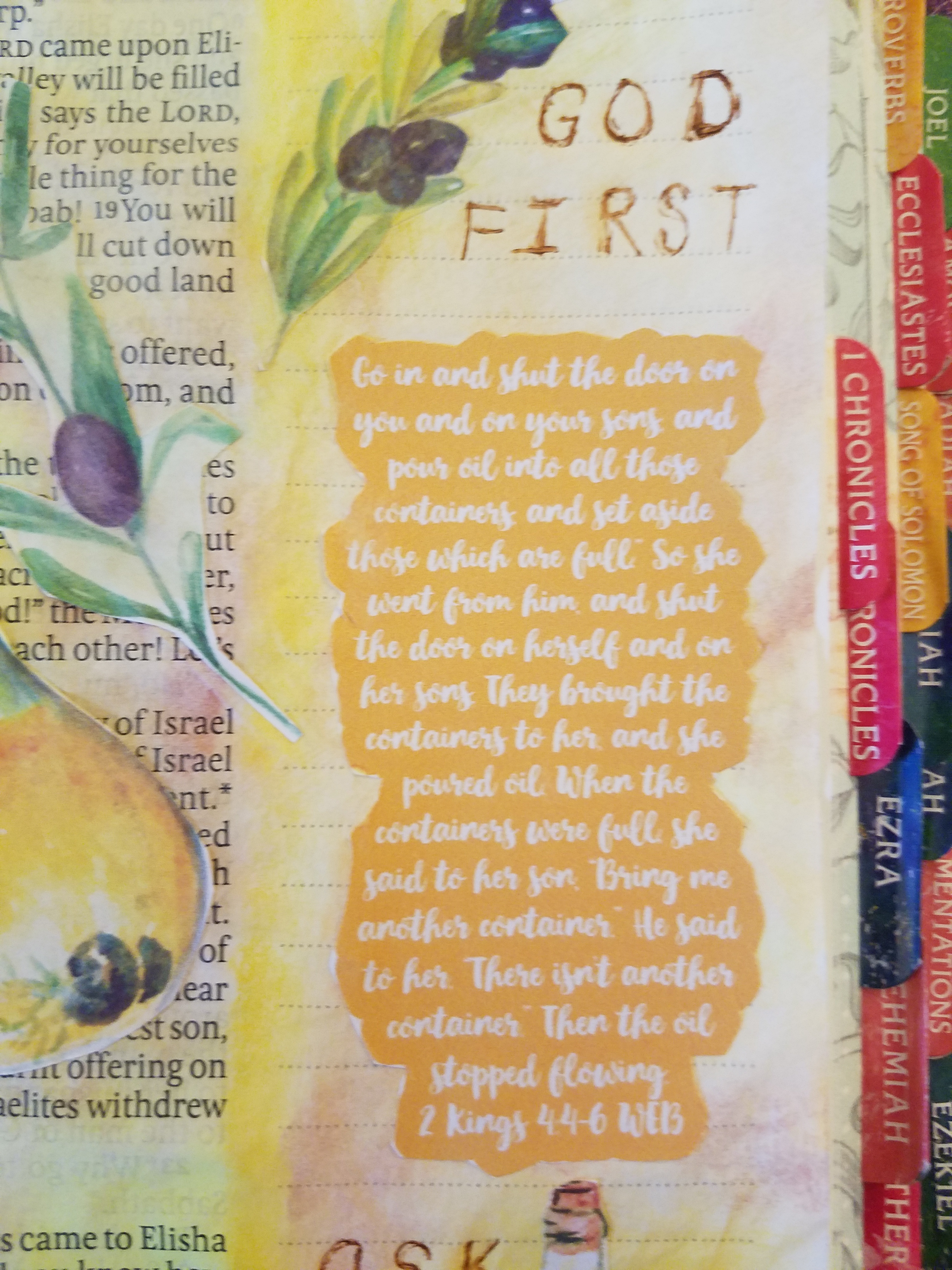 As I was speaking to my husband about this, I was telling him that I was really struggling with what to do, how to share with you all, what to focus on, etc. He asked me if I knew what the oil signified. The oil is a symbol of the Holy Spirit, His presence, and healing that comes from Him. So, I began thinking about how this related to our topic of New Beginnings. The Holy Spirit helps us as we step out in faith to do what God is asking of us. The woman stepped out in faith and did what Elisha told her to do, even though it didn’t make any sense. God rewarded her for her faith and obedience. She received more oil than just what was needed to pay the debt, she had enough to live on and she had a new beginning that was free from debt.