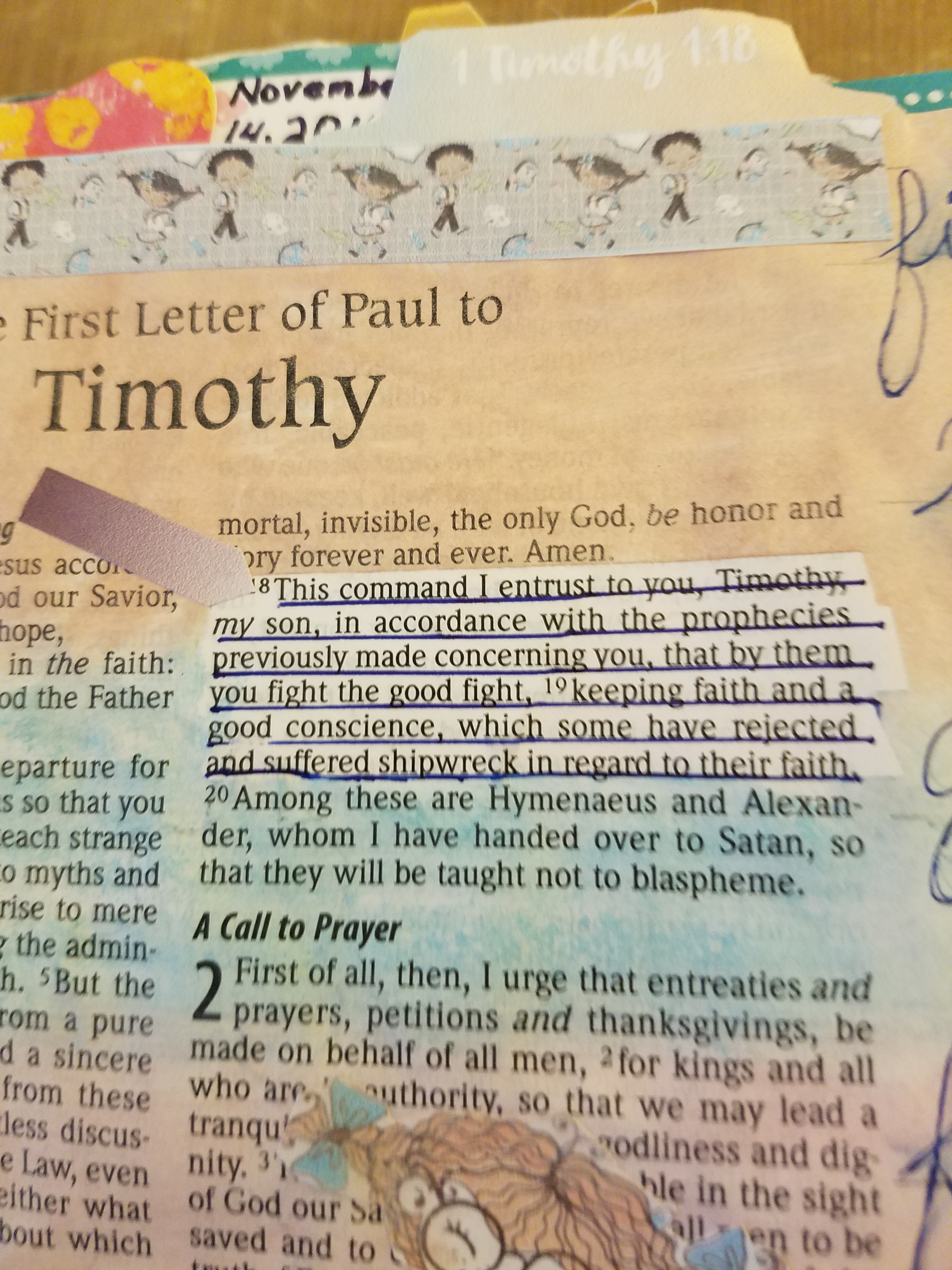 The Apostle Paul was giving instruction to Timothy and encouraging him. 1 Timothy 1:18-19 says, “This command I entrust to you, Timothy, my son, in accordance with the prophecies previously made concerning you, that by them you fight the good fight, keeping faith and a good conscience, which some have rejected and suffered shipwreck in regard to their faith.” (NASB)