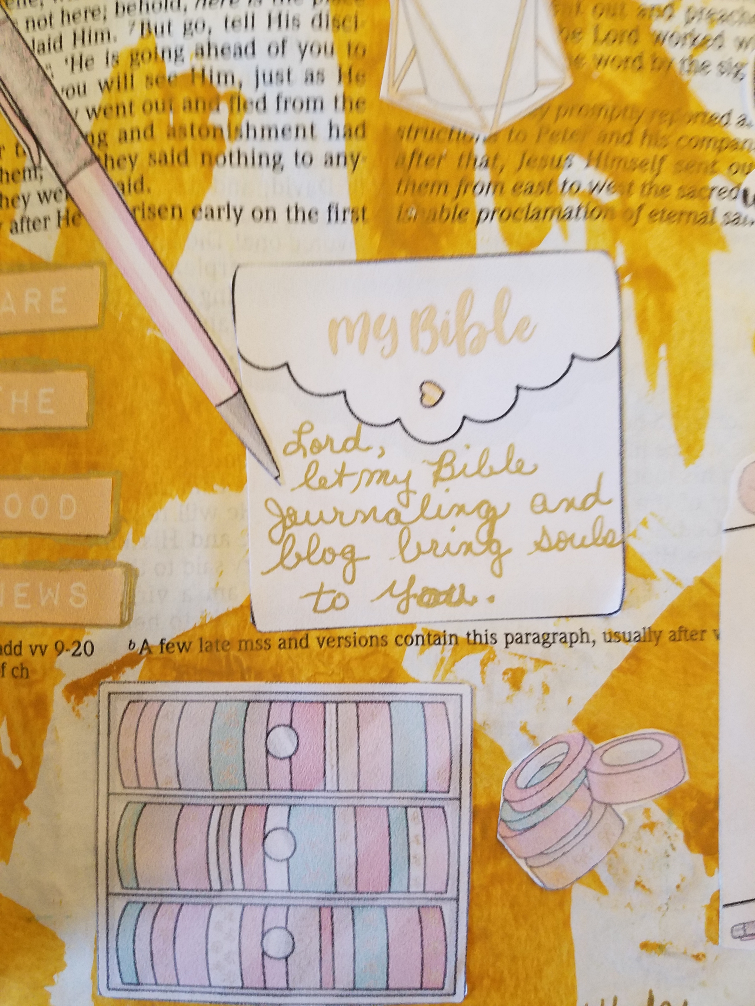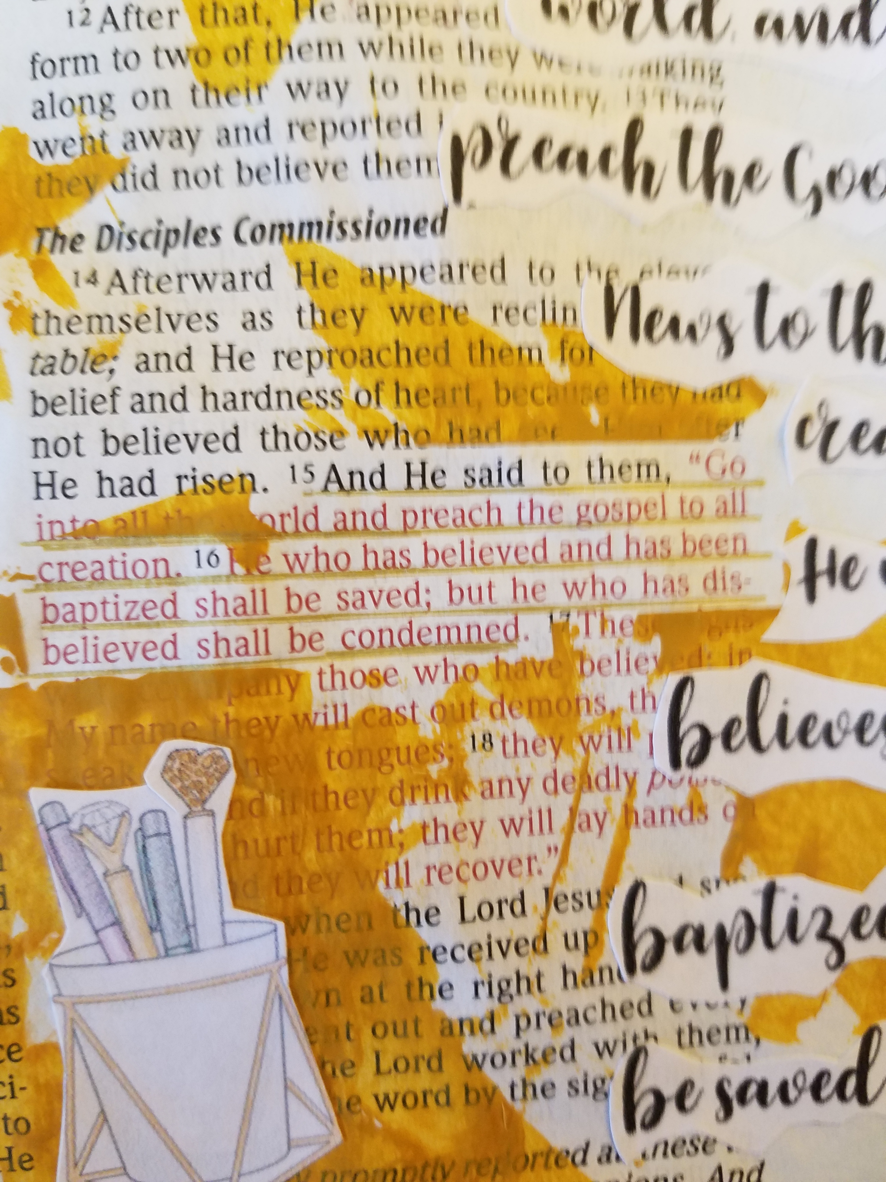 Declare His glory, there is no better way than to share the Gospel with those around us. I use this blog and my Bible Journaling as an avenue to share what Jesus has done for us. I also am part of the worship team at my church, and I use my music to share what Jesus means to me. My husband is a literature evangelist. He shares through tracts and he has a website where he is writing a commentary on the book of Revelation. Some people go door to door and witness. There are so many different avenues in sharing, as many as there are people! It means telling people what Jesus has done for you.