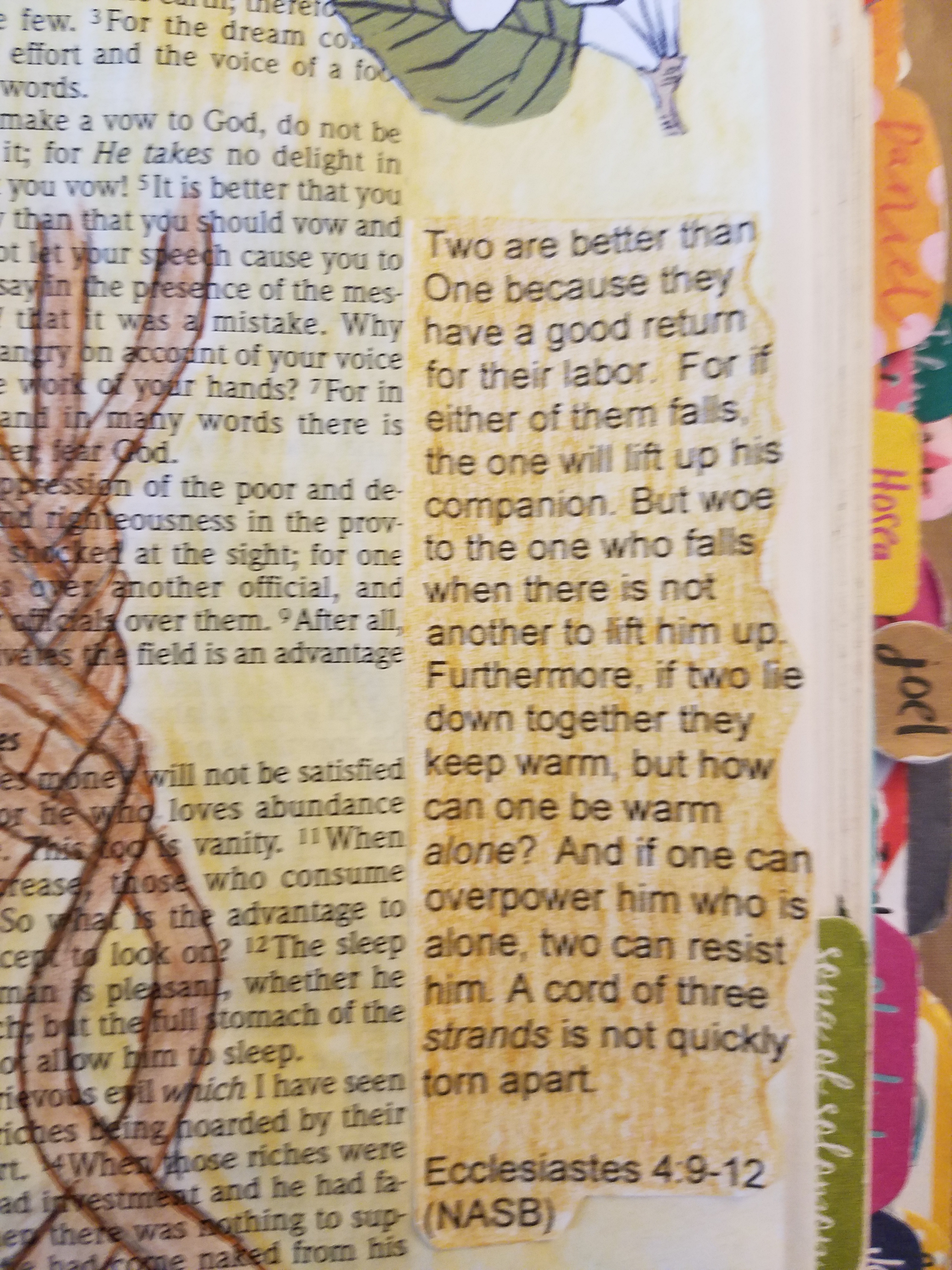 God never intended for us to do life alone. He created us to be part of a group, whether it is a family, friends, or acquaintances. He also created us so that we could have a relationship with Him. He created us with a deep desire to be with others. He also created us with a God-shaped space in our hearts that could only be filled with Himself. The end of our Scripture passage talks about a three-stranded cord. It is good to have a friend to walk beside us, but what is better is to have that friend, plus Jesus, walking with us. Just as Solomon says two are better than one, three are much better! He says with three together, the cord cannot be broken. This passage is usually used in wedding ceremonies, but it can be applied to friendships as well. Us, our friend, and Jesus make a strong wall against the enemy.