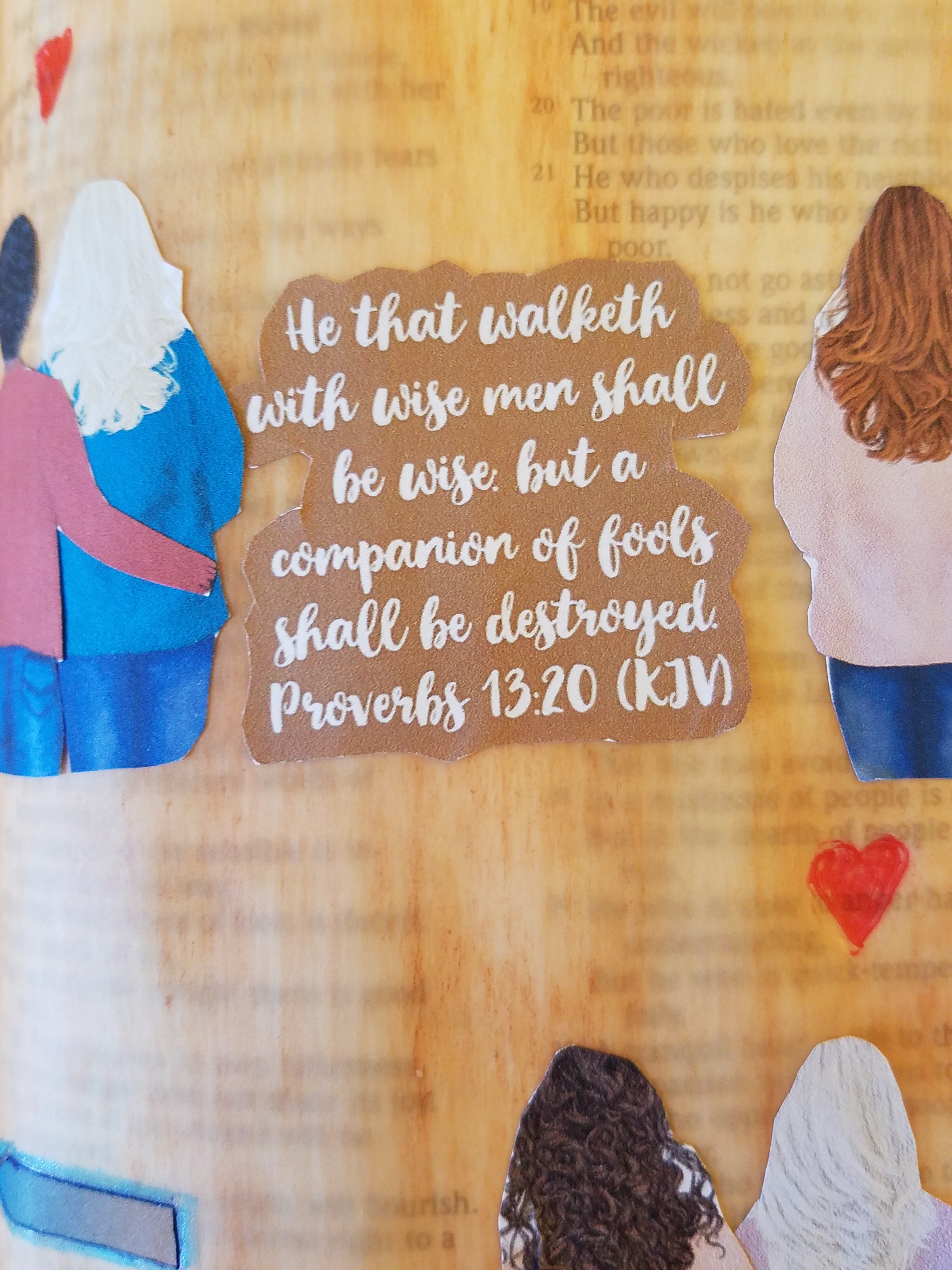 Solomon is telling his son that having wise friends will be for his betterment. In Proverbs 19:20-21, He advises, “Listen to advice and accept instruction, that you may gain wisdom in the future. Many are the plans in the mind of a man, but it is the purpose of the Lord that will stand.” (ESV) Christian friends are a treasure! They will give us wise counsel based upon Scripture. They will help us in our walk with the Lord, wanting to see us grow in our life with Christ. They want to see that our Christian witness is true and honorable. When we are trying to hear from God and are not sure of what He has told us, we can ask a wise friend for advice, and they will pray, ask for discernment, and give us what God has placed upon their heart.