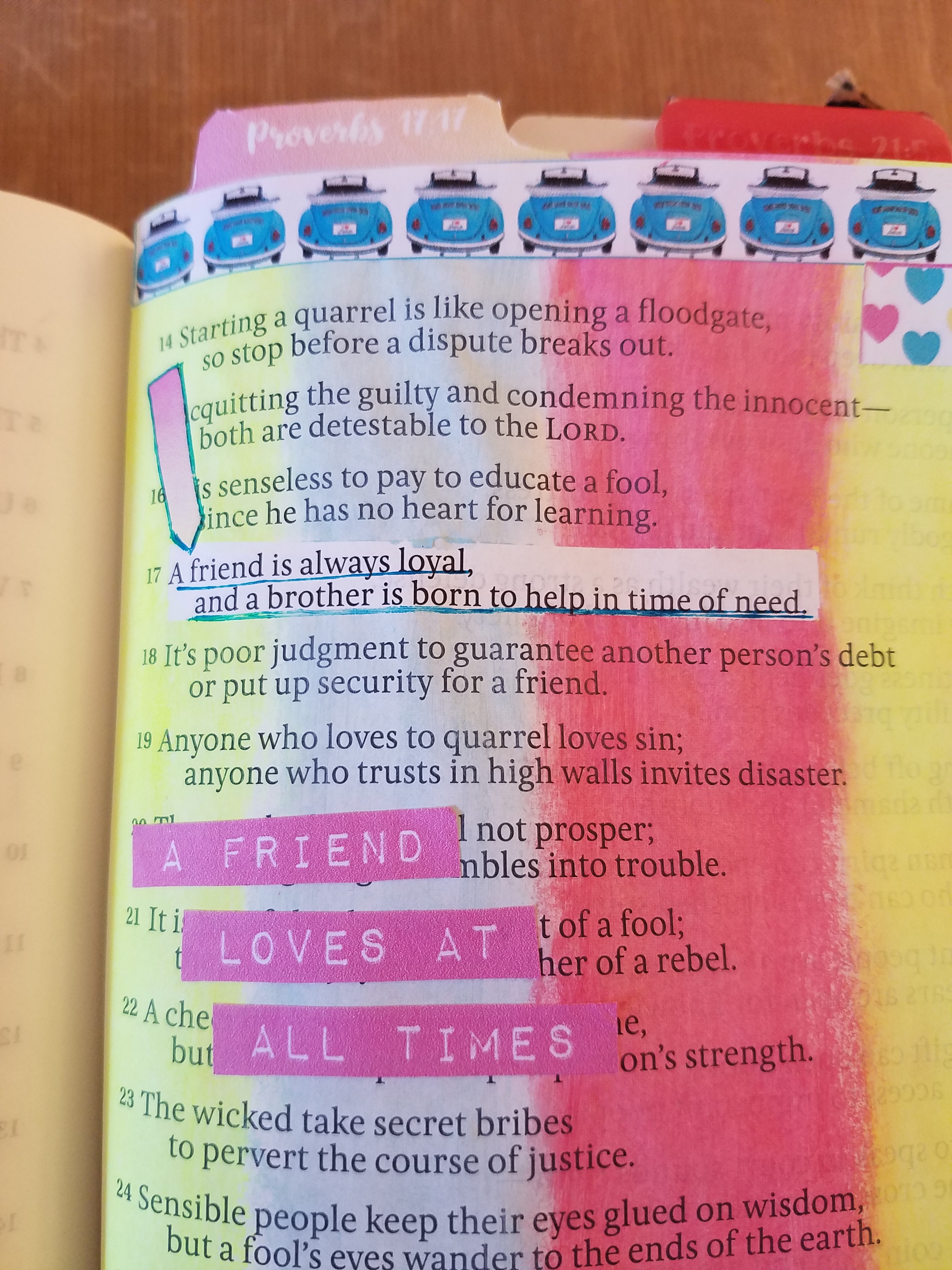I love how the NLT puts it, “A friend is always loyal.” A good friend is one we can turn to for help or just to spend time with and enjoy their company. When we build a strong bond with a friend like that, the relationship is held together because of the love friends share for each other. I also like how the NLT states that a brother (or sister) is born to help us when we are in need. That’s what I love about having Christian brothers and sisters in a fellowship such as the local church. They come together to assist those who are going through difficult times and rejoice with those who receive blessings from God.