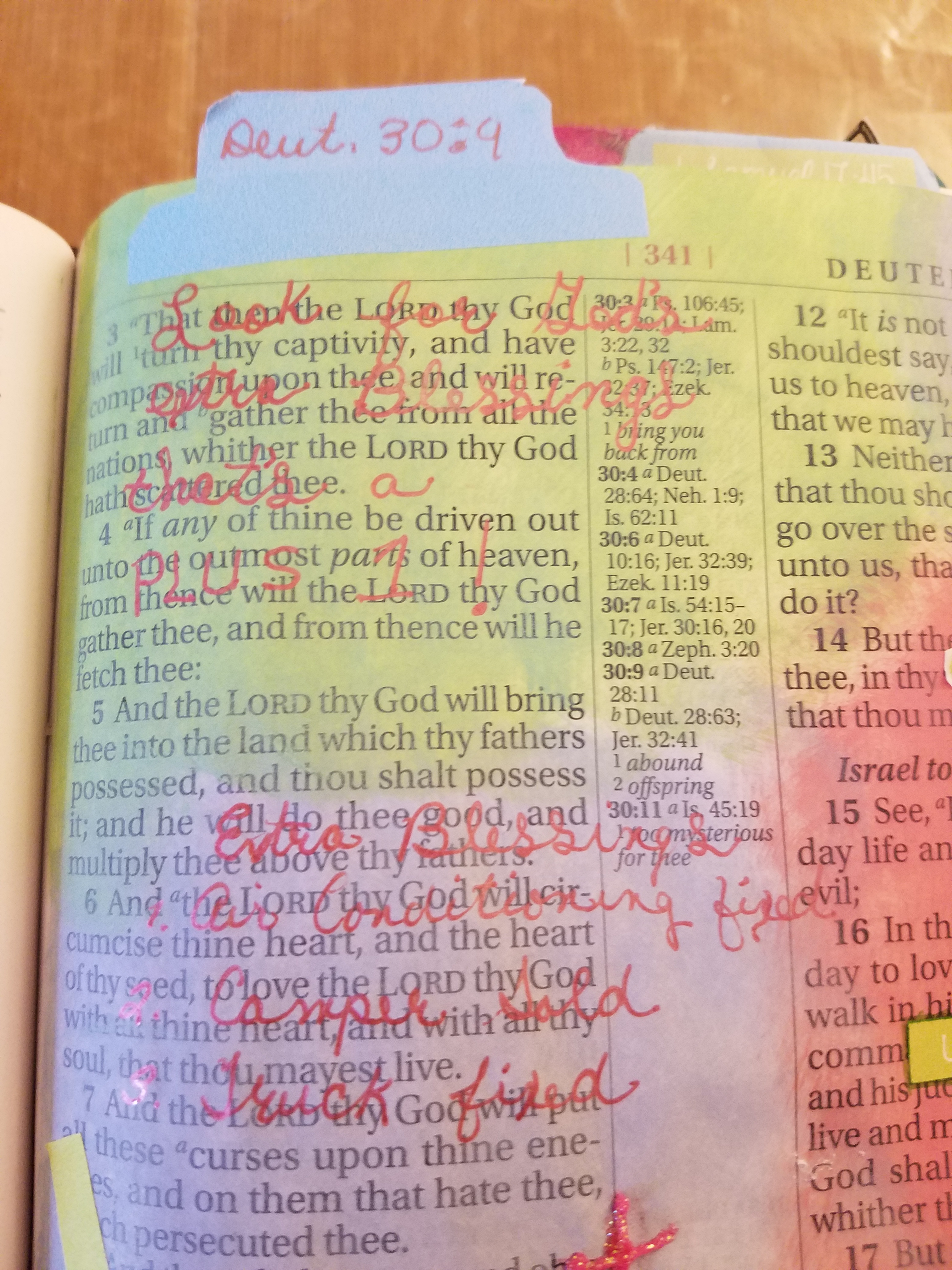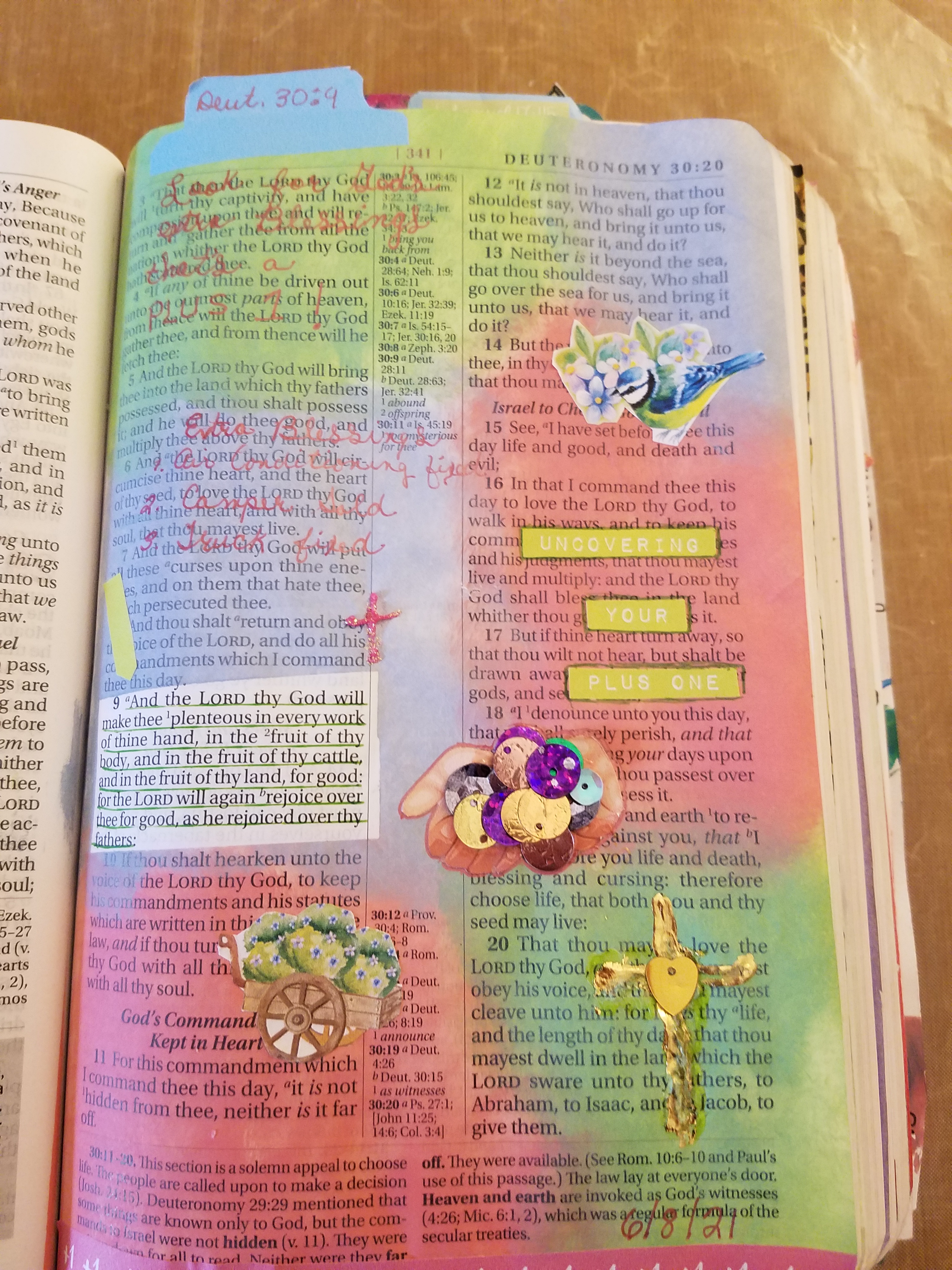 This month we are looking at “Uncovering Your Plus One”. You ask, “What’s a Plus One?” A Plus one is an unexpected blessing that God bestows upon His children. Our Bible Journaling verse today says, “And the Lord thy God will make thee plenteous in every work of thine hand, in the fruit of thy body, and in the fruit of thy cattle, and in the fruit of thy land, for good: for the Lord will again rejoice over thee for good, as he rejoiced over thy fathers:” (Deuteronomy 30:9 KJV) I like the way the NASB puts it, “Then the Lord your God will prosper you abundantly in all the work of your hand, in the offspring of your body and in the offspring of your cattle and in the produce of your ground, for the Lord will again rejoice over you for good, just as He rejoiced over your fathers;” (NASB 1995)