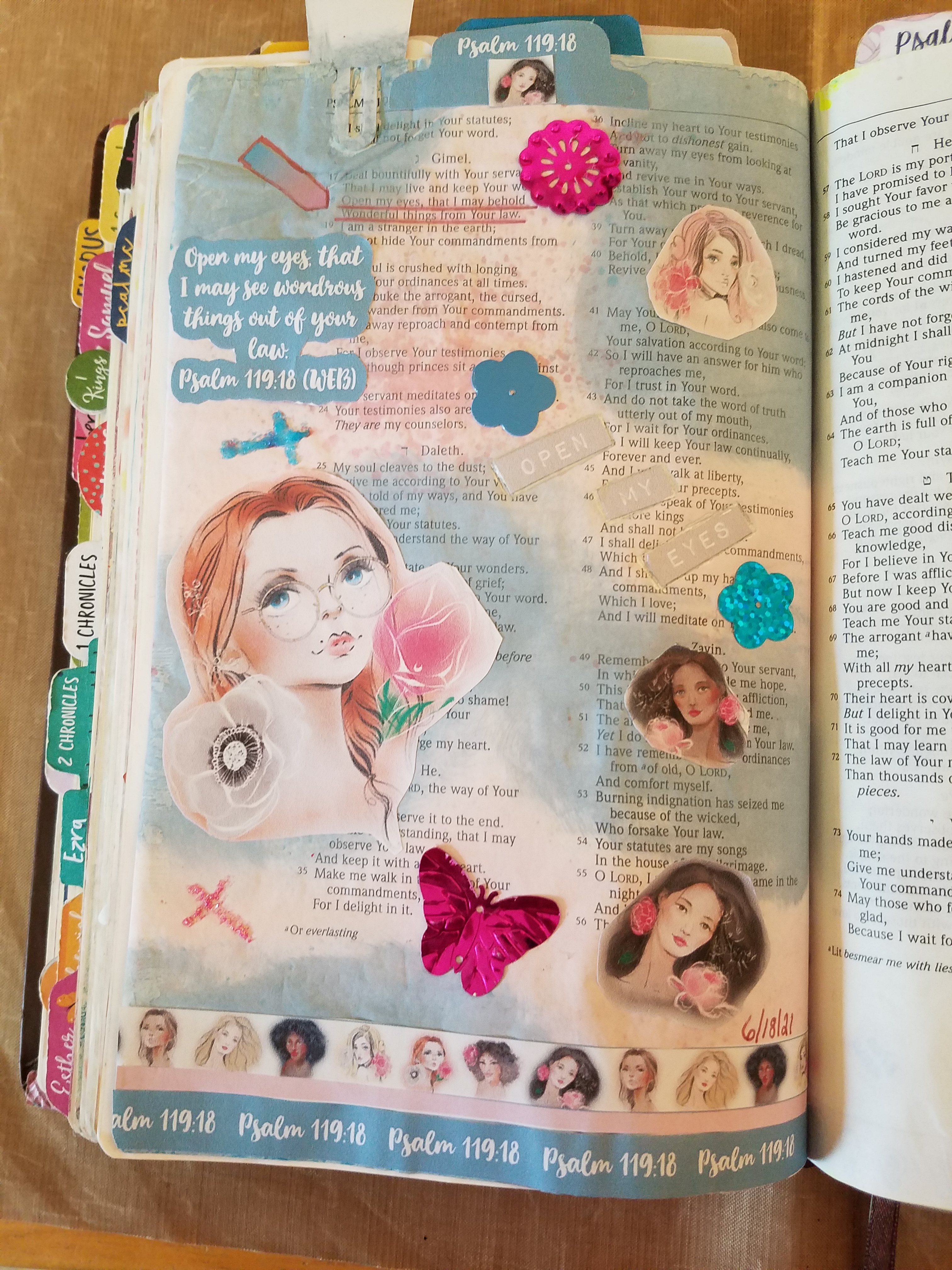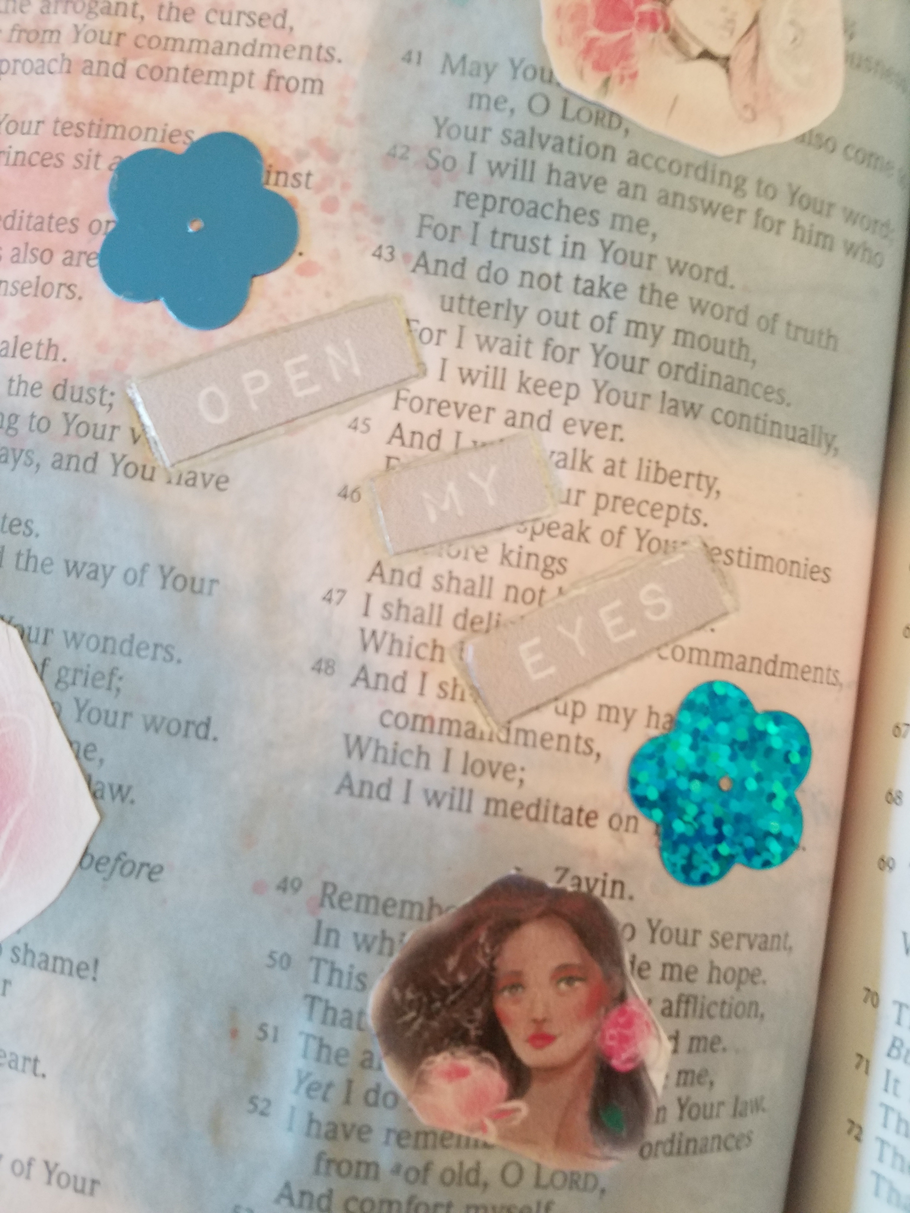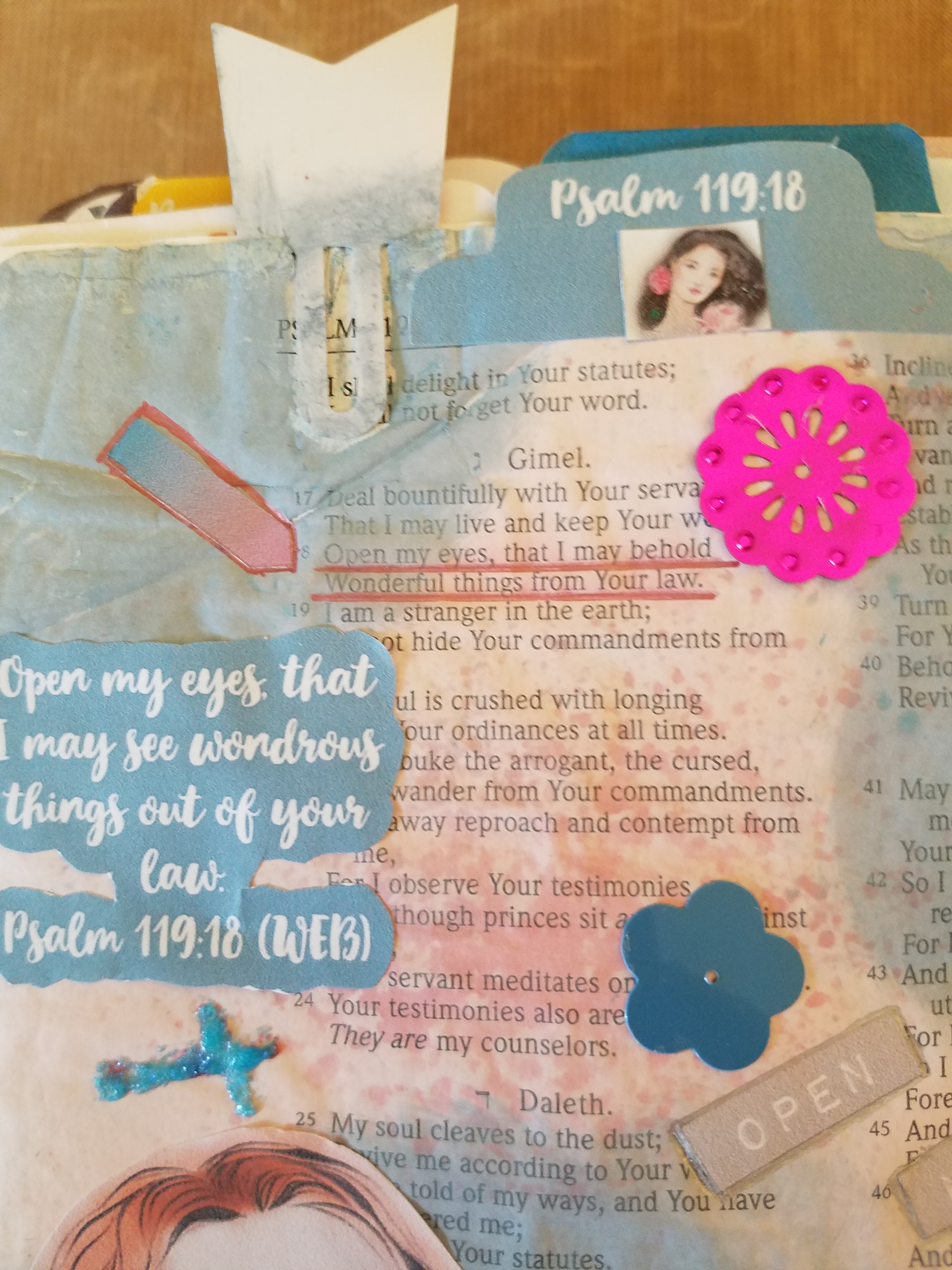 When we read our Bibles, do we just read it or do we dig into it, looking for those tidbits of knowledge that at first glance, seem not to be something to hold onto, but are truths that can take us forward in our walk with the Lord? Today’s Bible Journaling verse says, “Open my eyes, that I may behold Wonderful things from Your law.” (Psalm 119:18 NASB1995) Is that the cry of our hearts? Do we yearn to see the little things in God’s Word that could turn out to be something important?