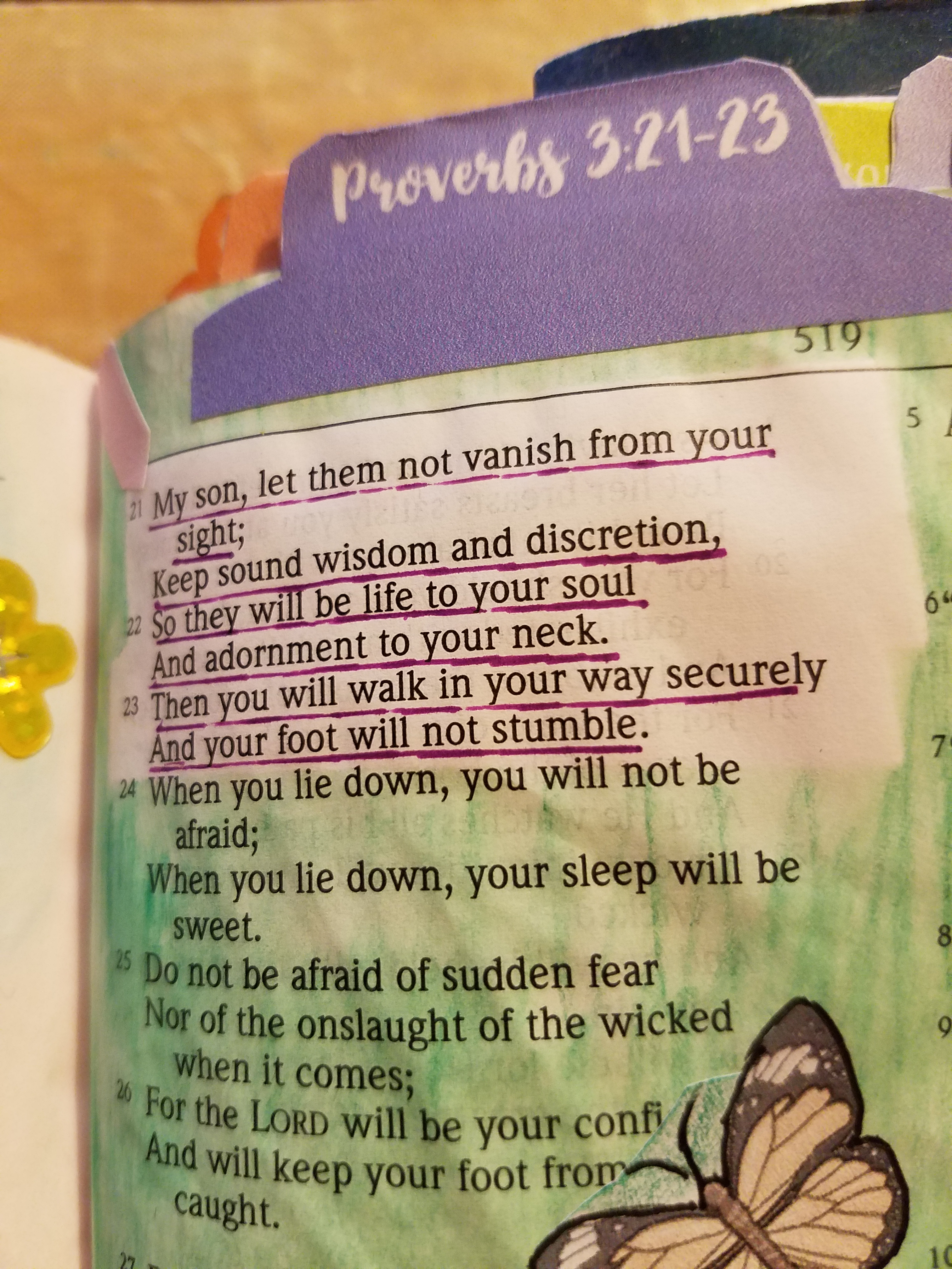 I’ve been off of the blog for a couple of months because we have moved cross country and I haven’t been able to do any journaling. We don’t have a house right now and are living in our RV at a county park as camp hosts until we find a house. Everything is in storage, and life is kind of upside-down at the moment. But, today’s Scripture encourages me in that, we know God orchestrated this move despite all the difficulties we have encountered. Solomon is teaching his son about wisdom and discretion (or knowledge) and tells him, “My son, let them not vanish from your sight; Keep sound wisdom and discretion, so they will be life to your soul and adornment to your neck. Then you will walk in your way securely and your foot will not stumble.” (Proverbs 3:21-23 NASB1995)
