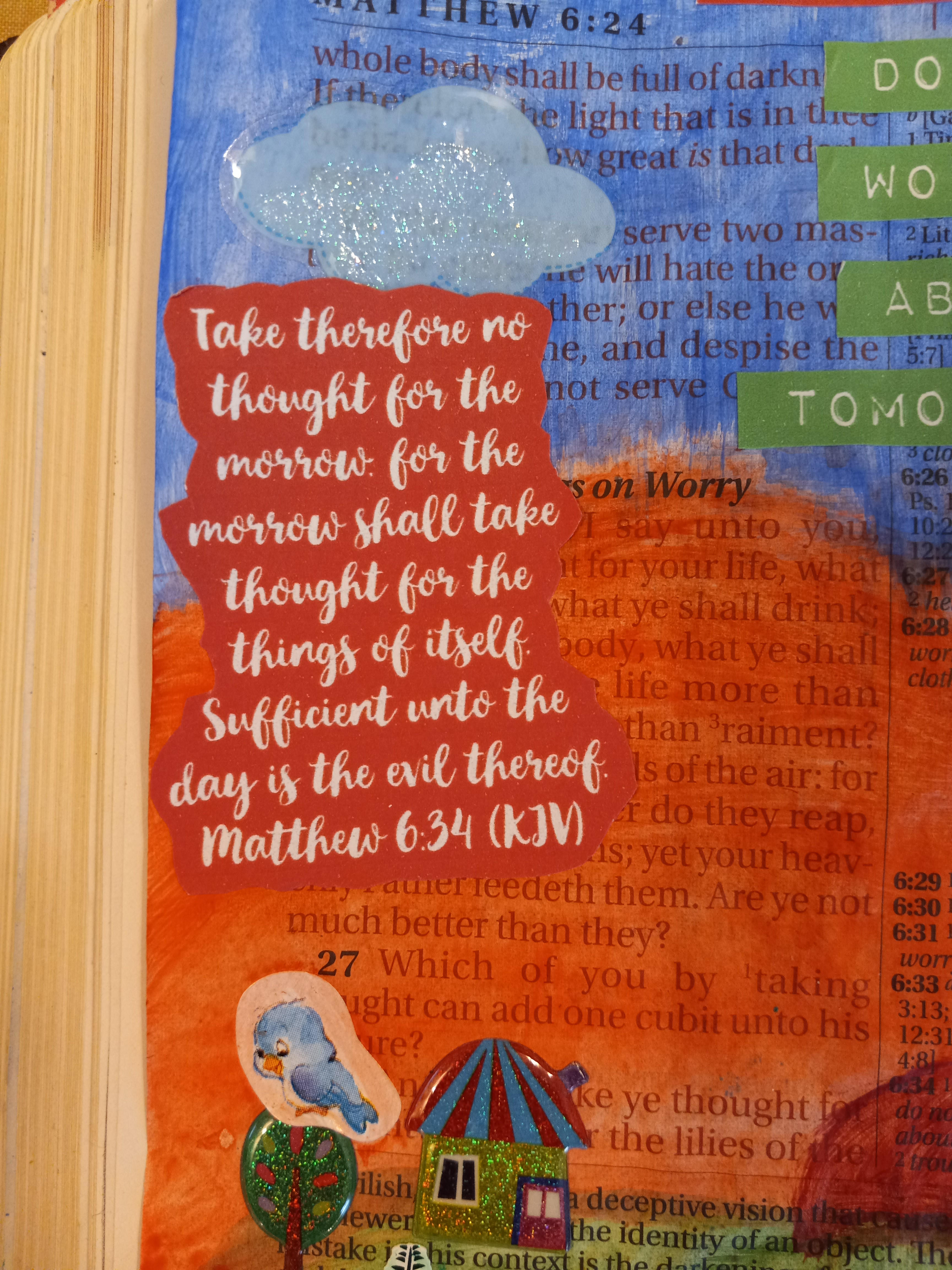 Worrying is something some people seem to be good at doing. They fret over things that may never happen, and in the process, they live their lives in turmoil, without peace. To have peace in our lives, Jesus tells us we are not to worry, especially about material things. Matthew 6:34 says, “Take therefore no thought for the morrow: for the morrow shall take thought for the things of itself. Sufficient unto the day is the evil thereof.” (KJV) The New American Standard Bible (1995) puts it this way, “So do not worry about tomorrow; for tomorrow will care for itself. Each day has enough trouble of its own.”