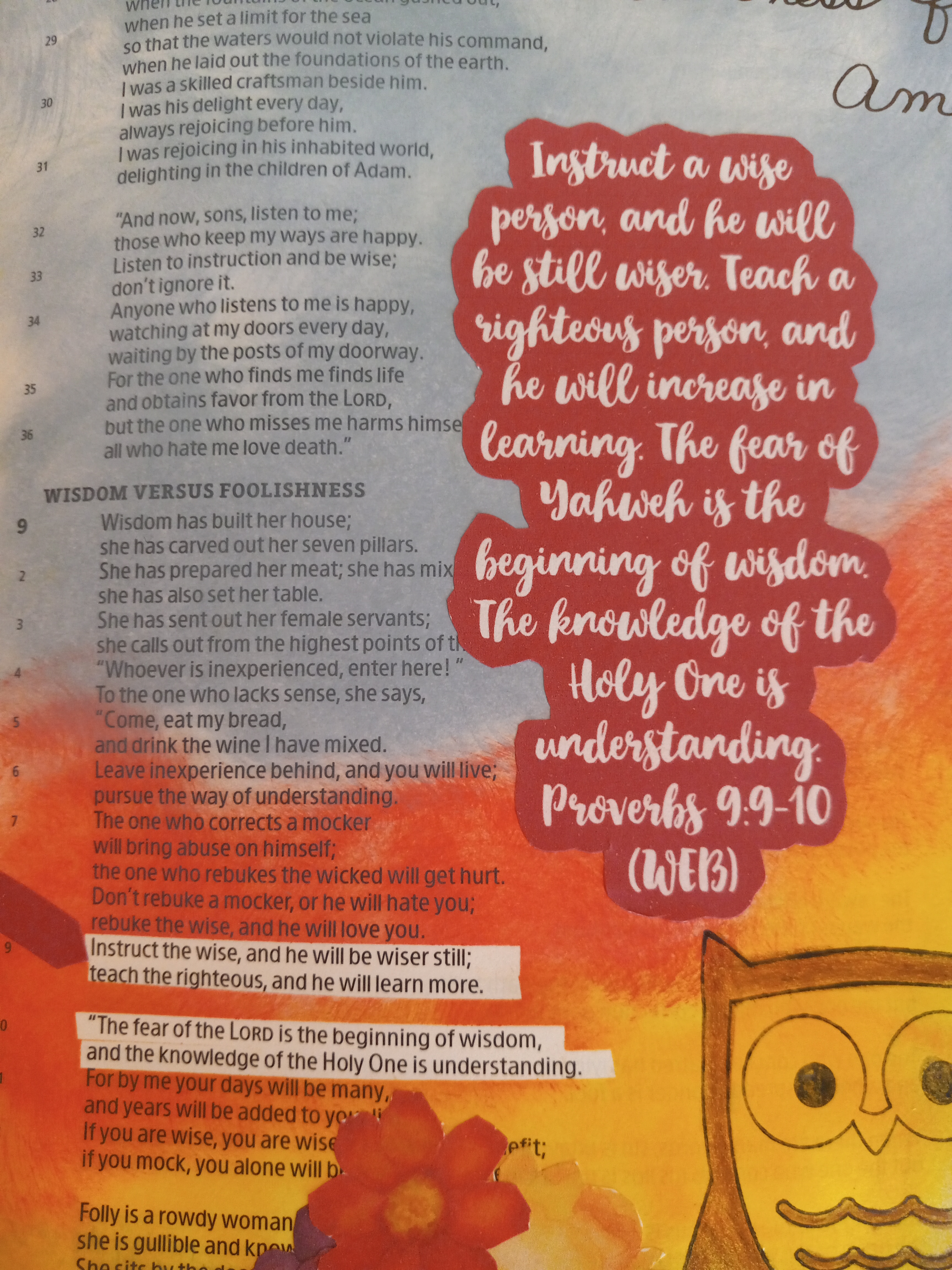 Sometimes, God whispers to us using that Still, Small Voice that says, “Stop! Try it this way.” It is up to us to listen to and follow that Voice. When we feel that tug in our hearts when we are trying to make decisions, that tug is the Holy Spirit advising us, giving us wisdom that we need to heed. The more we listen to that prompting of the Holy Spirit, the more we grow in wisdom and instruction from God. We learn more, not only about God and His character, but we learn how to deal with life in ways that are wise and help us to gain knowledge of how to live this Christian life. When we apply what we learn, we give honor and glory to the One who grants us wisdom.