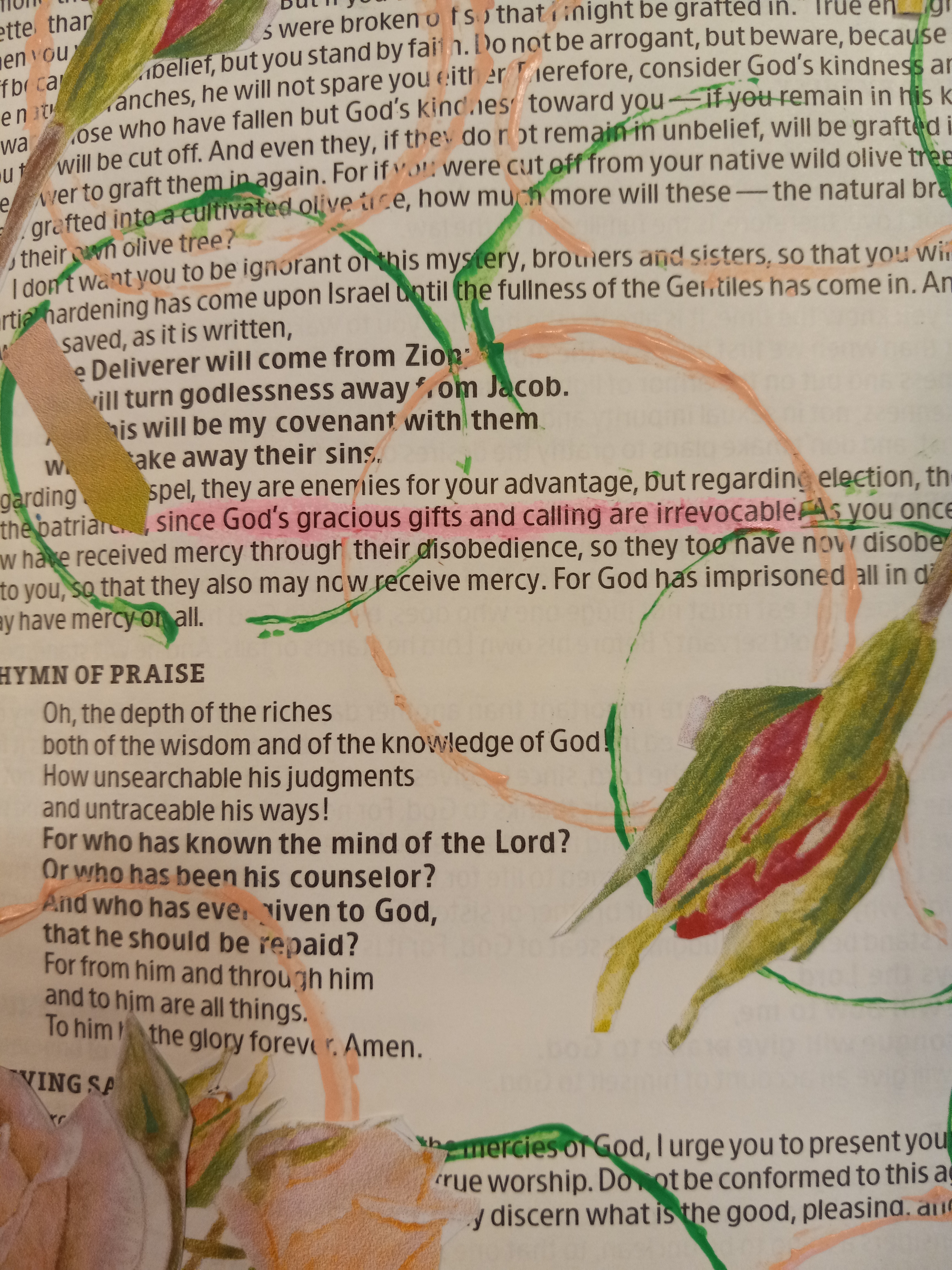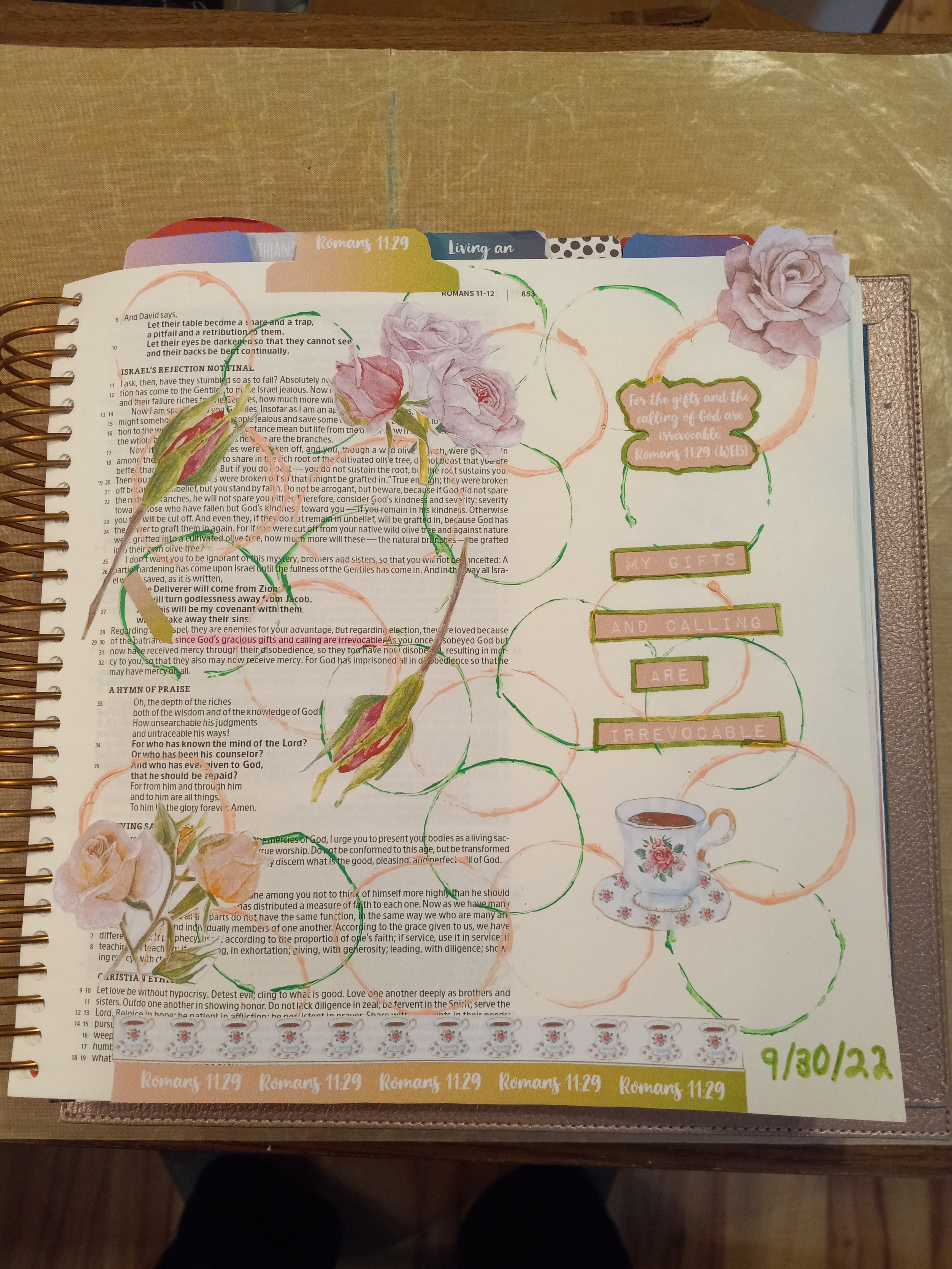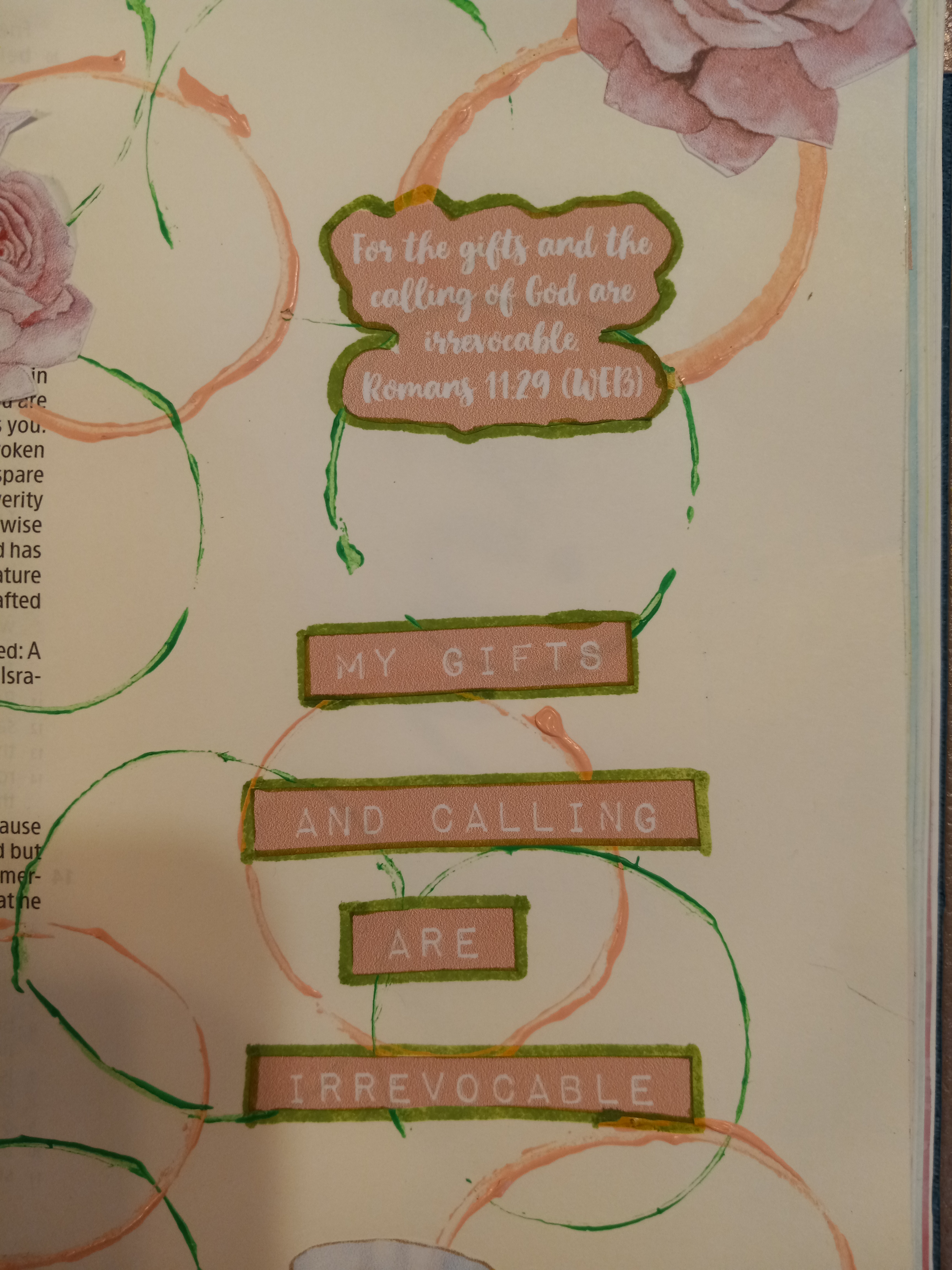 As we continue our look into the Spiritual Gifts God gives us, our Bible Journaling verse today is Romans 11:29, “since God’s gracious gifts and calling are irrevocable.” (CSB) The Living Bible (TLB) says, “For God’s gifts and his call can never be withdrawn; he will never go back on his promises.” The King James Version says that the gifts and calling are, “without repentance.” The word irrevocable means without change of mind or purpose. Once God gives us a gifting or calling, He won’t take it back.