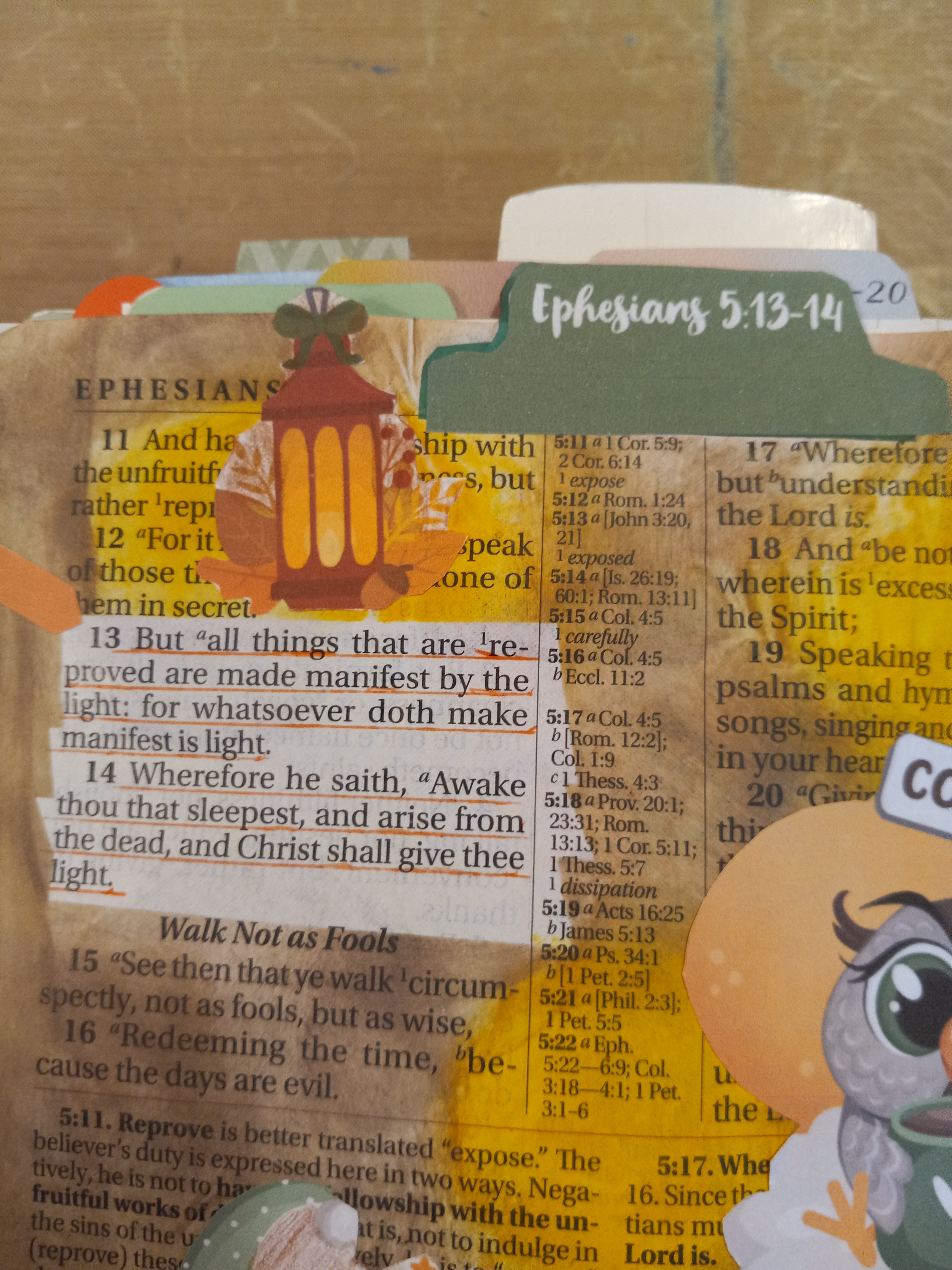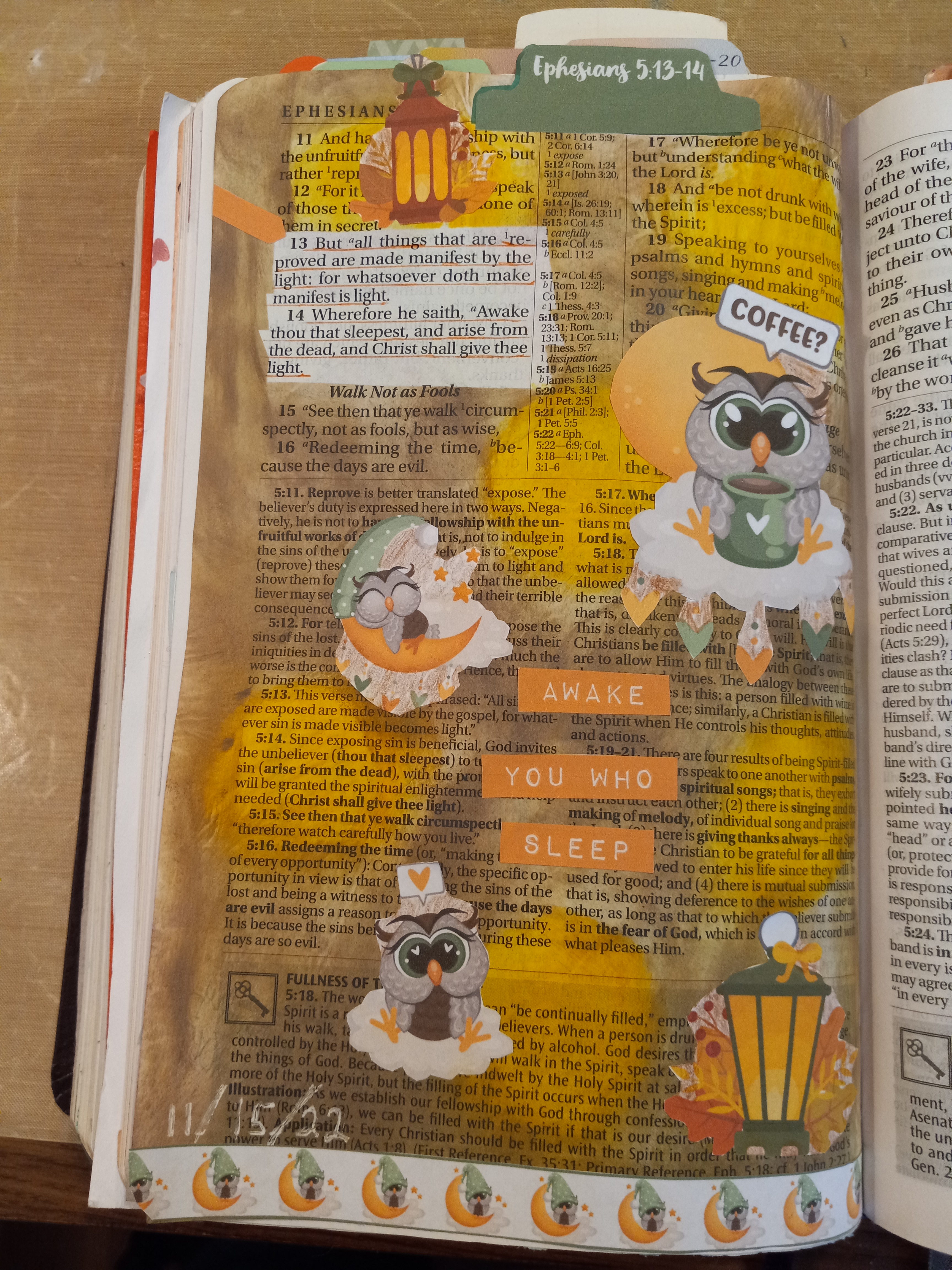 I think it’s safe to say that all of us would like to see a change in our society today.  We’ve heard it said that to see a change we must begin with ourselves.  Our world needs to wake up to the destruction going on around us, physically and Spiritually.  As we pray for our society to be awakened and to turn away from the evil that is going on today, we also need to pray that we are awakened as well. Our Bible Journaling Scripture today says, “But all things that are reproved are made manifest by the light: for whatsoever doth make manifest is light.  Wherefore he saith, Awake thou that sleepest, and arise from the dead, and Christ shall give thee light.” (Ephesians 5:13-14 KJV)  The NASB 1995 version is a little more understandable, “But all things become visible when they are exposed by the light, for everything that becomes visible is light. For this reason it says, ‘Awake, sleeper, And arise from the dead, And Christ will shine on you.’”