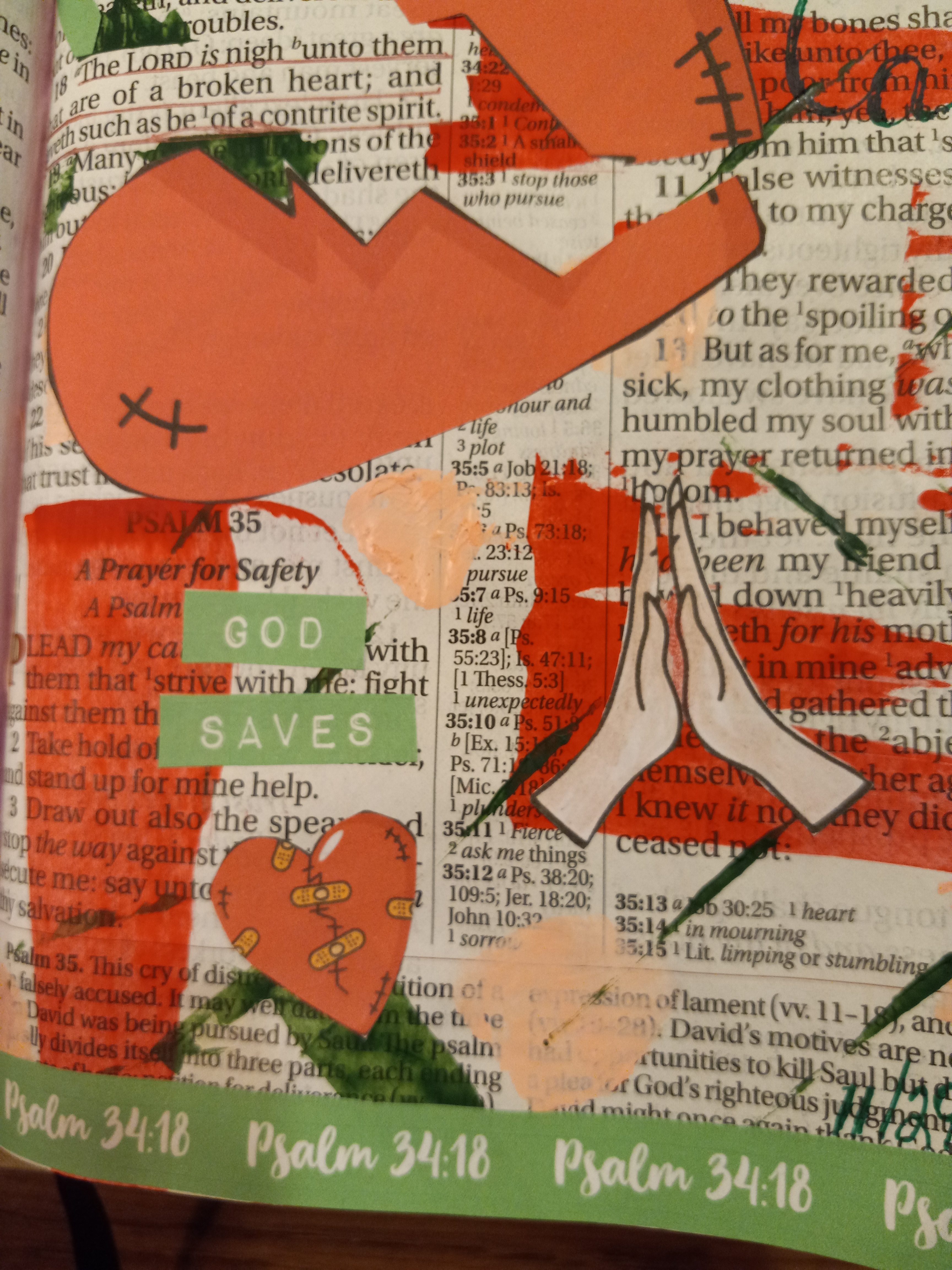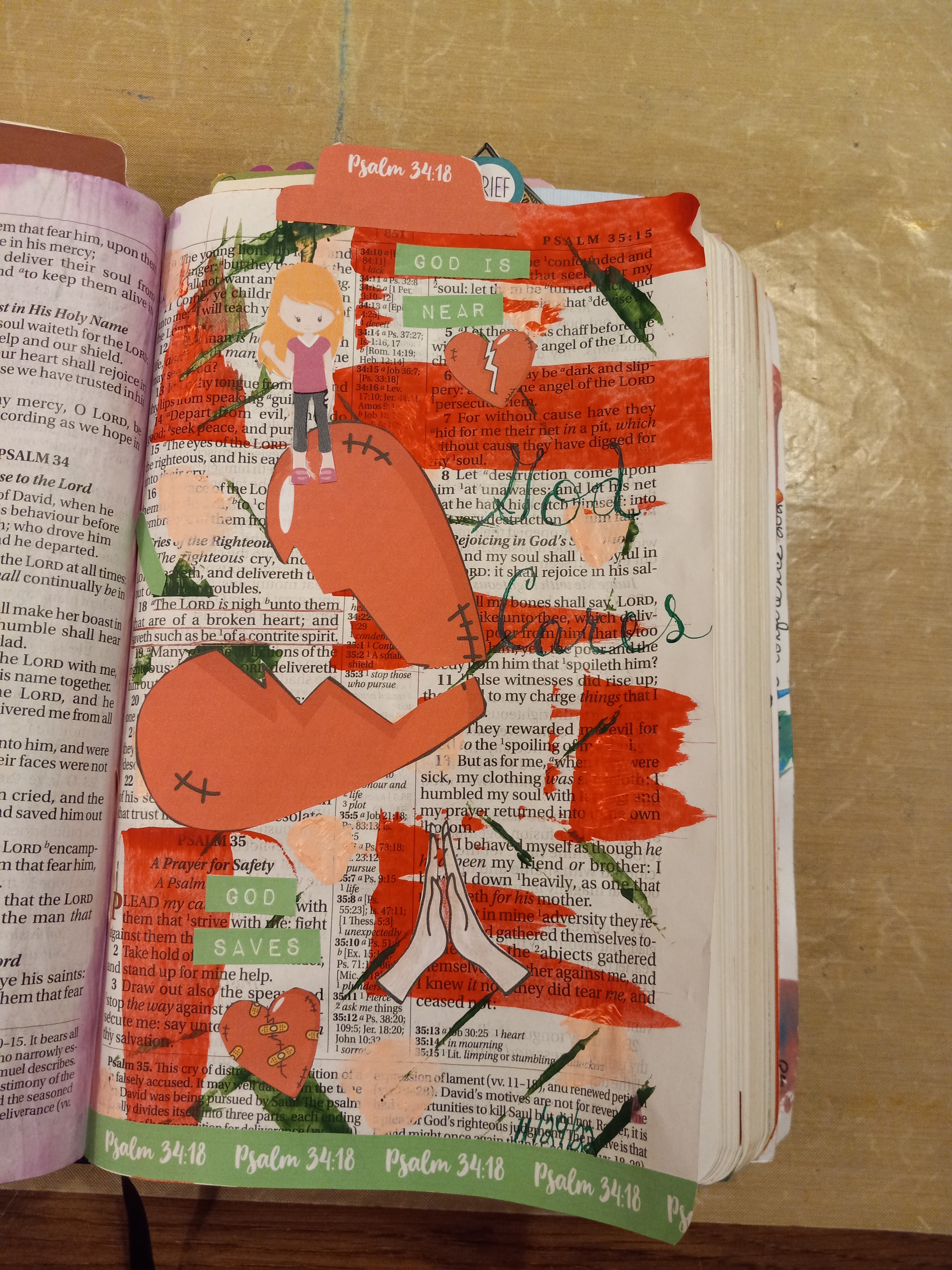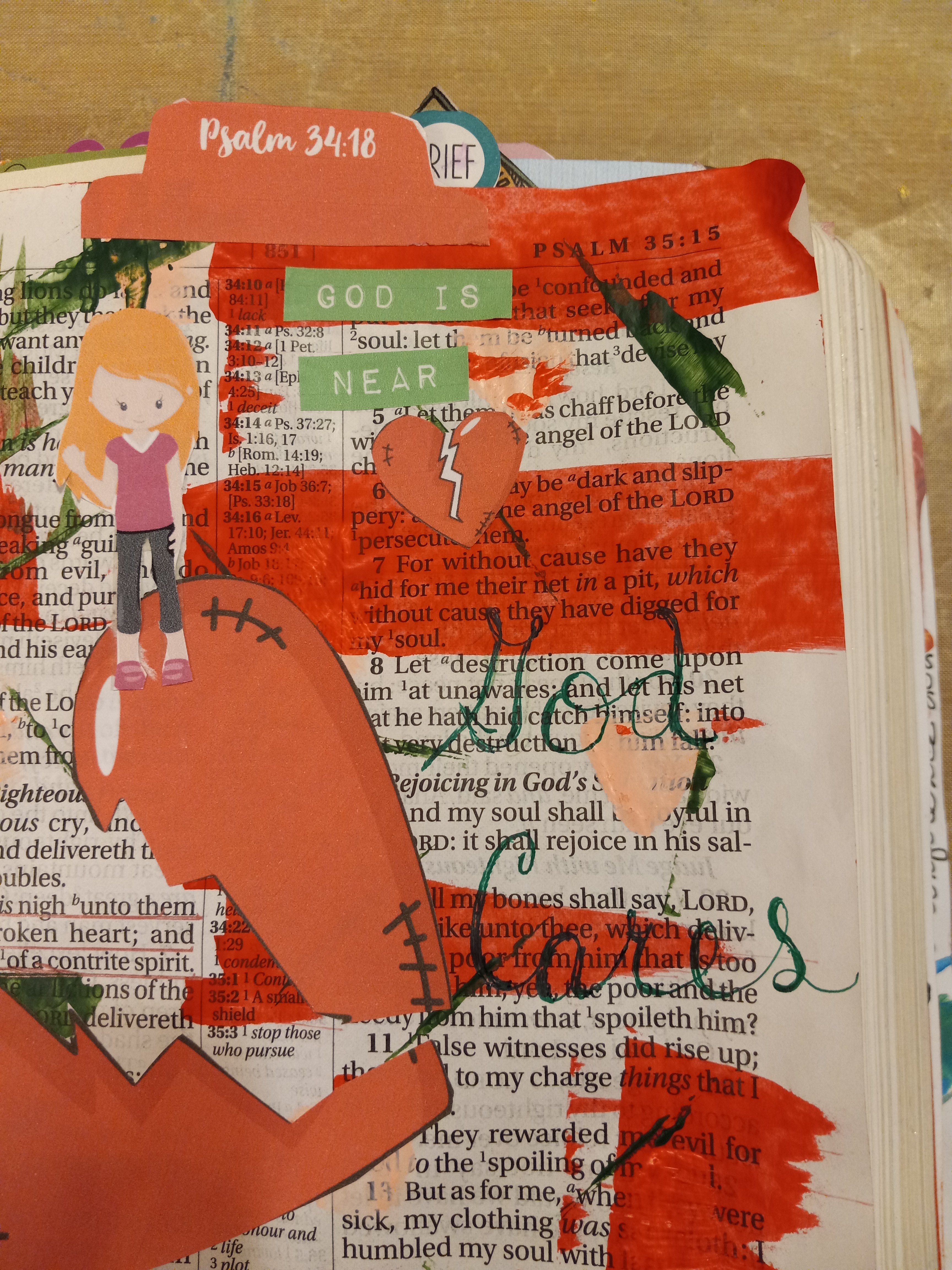 There are times in our lives when we encounter circumstances that can leave us broken-hearted and in despair. It could be that we have lost a loved one in death, or the financial situation we are faced with is more than we think we can bear, or maybe we have done something that has put our relationship with God at a distance. If any of this relates to you, God wants you to know that you are not alone, and He knows all about what you are going through. Our Bible Journaling verse today tells us, “The Lord is nigh unto them that are of a broken heart; and saveth such as be of a contrite spirit.” (Psalm 34:18 KJV)