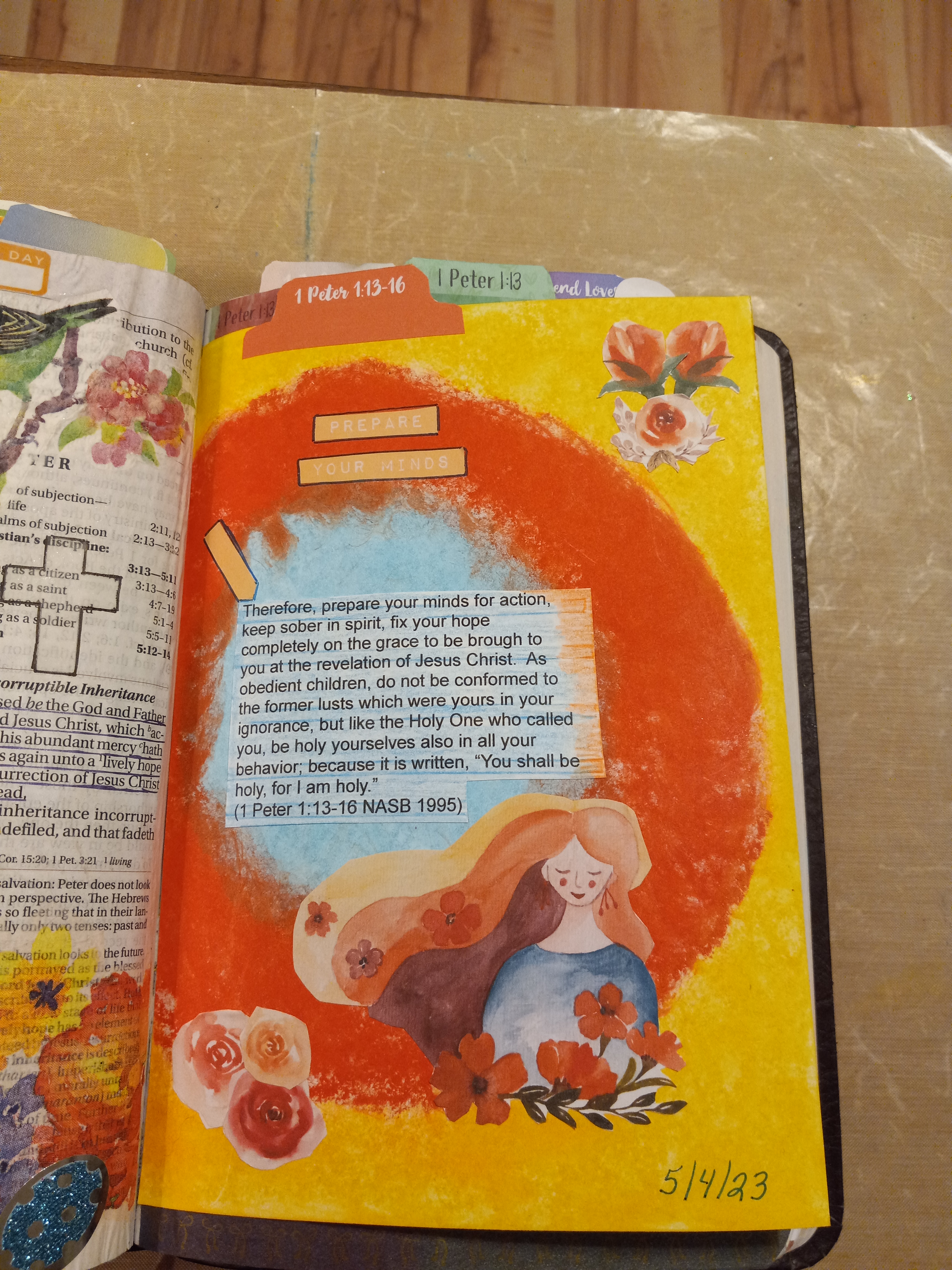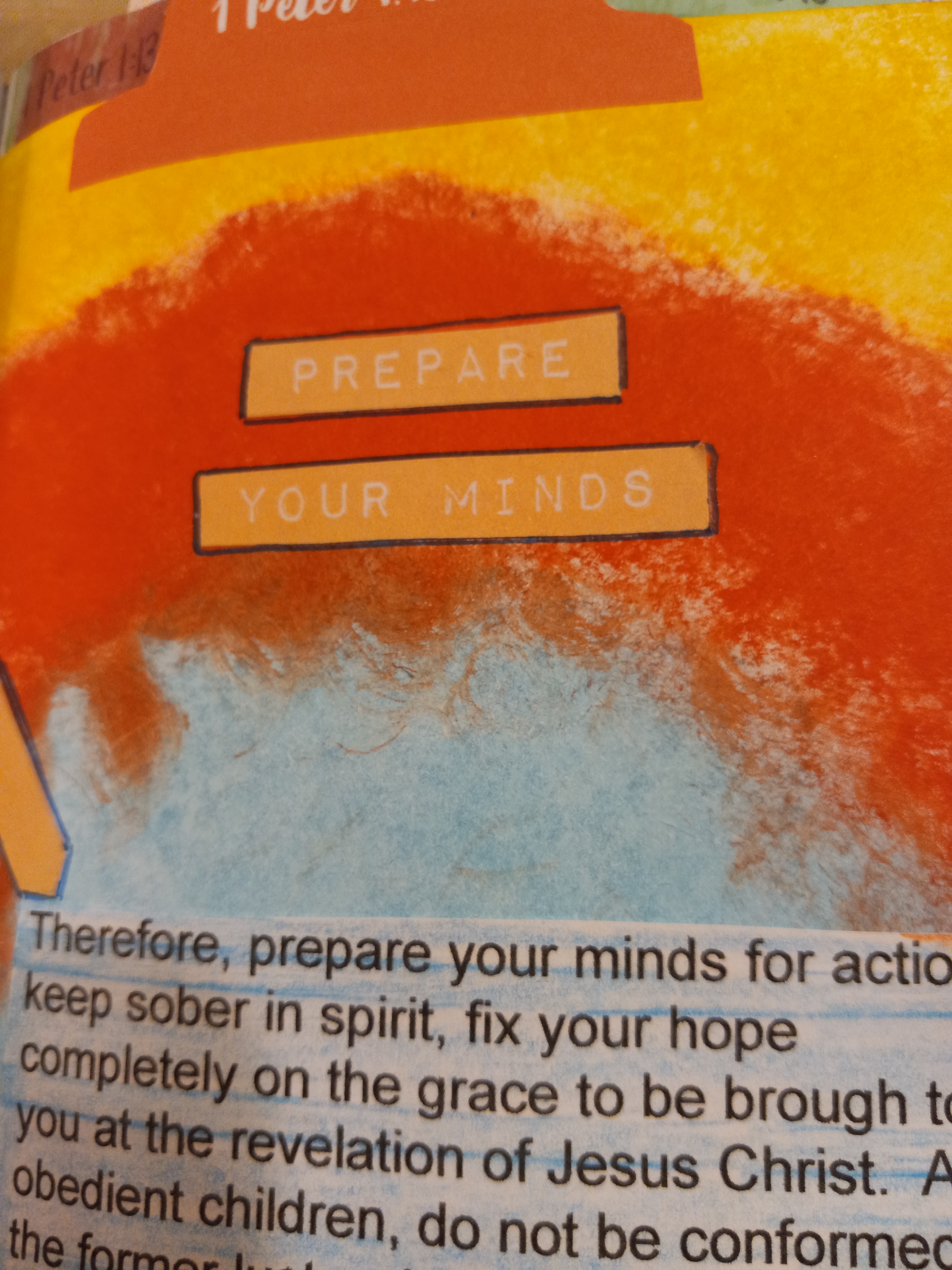 This month we are going to be looking at where our focus is. Our Bible Journaling Scripture is 1 Peter 1:13-16, “Therefore, prepare your minds for action, keep sober in spirit, fix your hope completely on the grace to be brought to you at the revelation of Jesus Christ. As obedient children, do not be conformed to the former lusts which were yours in your ignorance, but like the Holy One who called you, be holy yourselves also in all your behavior; because it is written, “You shall be holy, for I am holy.” (NASB 1995) Focus requires action on our part. Peter says we are to prepare our minds.