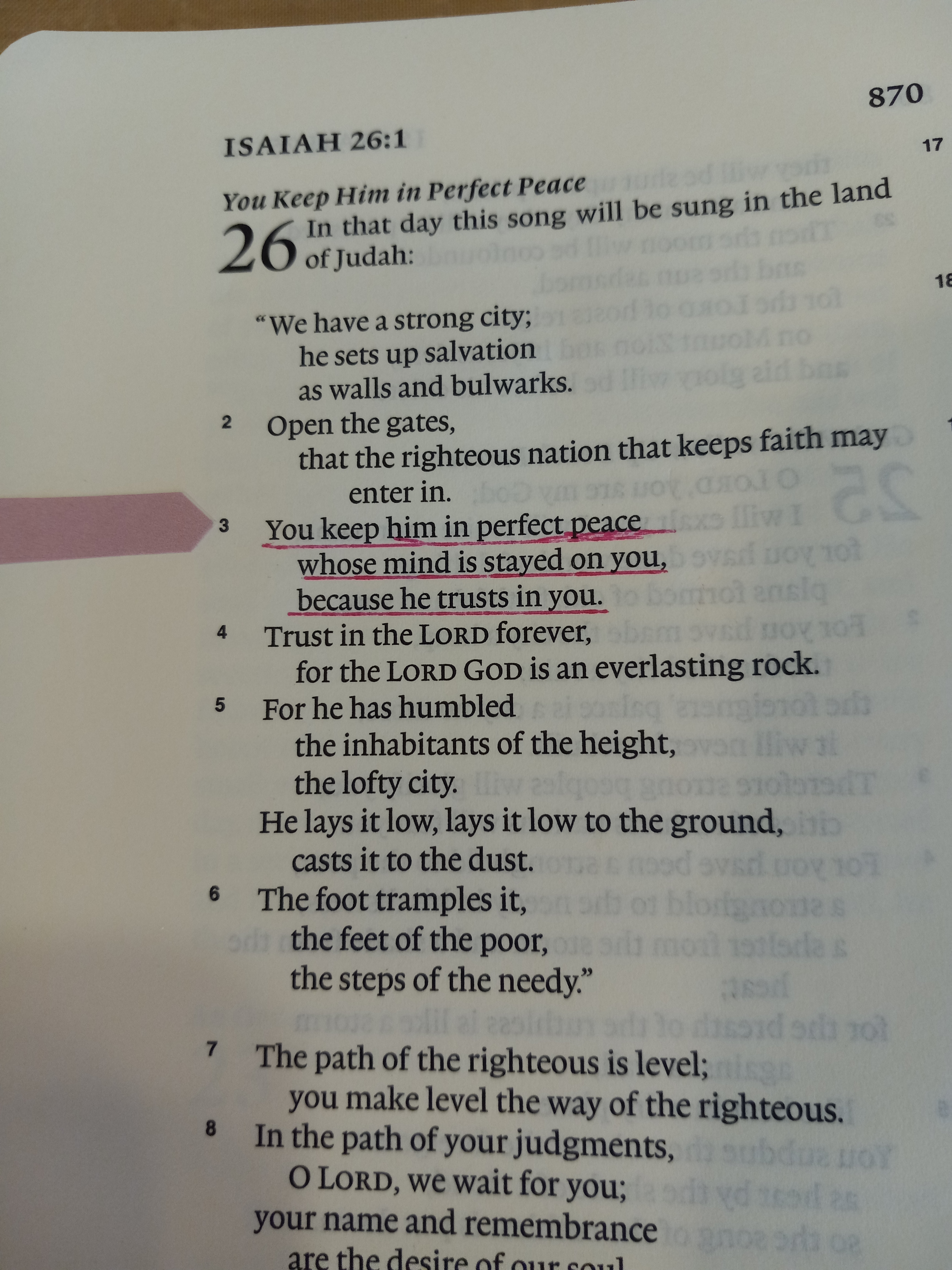 When we find ourselves at a point where peace seems fleeting, we must stop and turn our thoughts to our Heavenly Father. Think about all that He has done for us. Pray and ask Him to help us in times when we find ourselves at a point where even our attitudes are in chaos. The source of our peace comes when our minds have stayed on God. The NASB says, “The steadfast of mind You will keep in perfect peace, because he trusts in You.” Our verse tells me that my mind must be steadfast and that God is the only One whom I can trust, and when I put my trust in Him, He gives me peace that the world cannot give me! “And the peace of God, which transcends all understanding, will guard your hearts and your minds in Christ Jesus.” (Philippians 4:7 NIV)