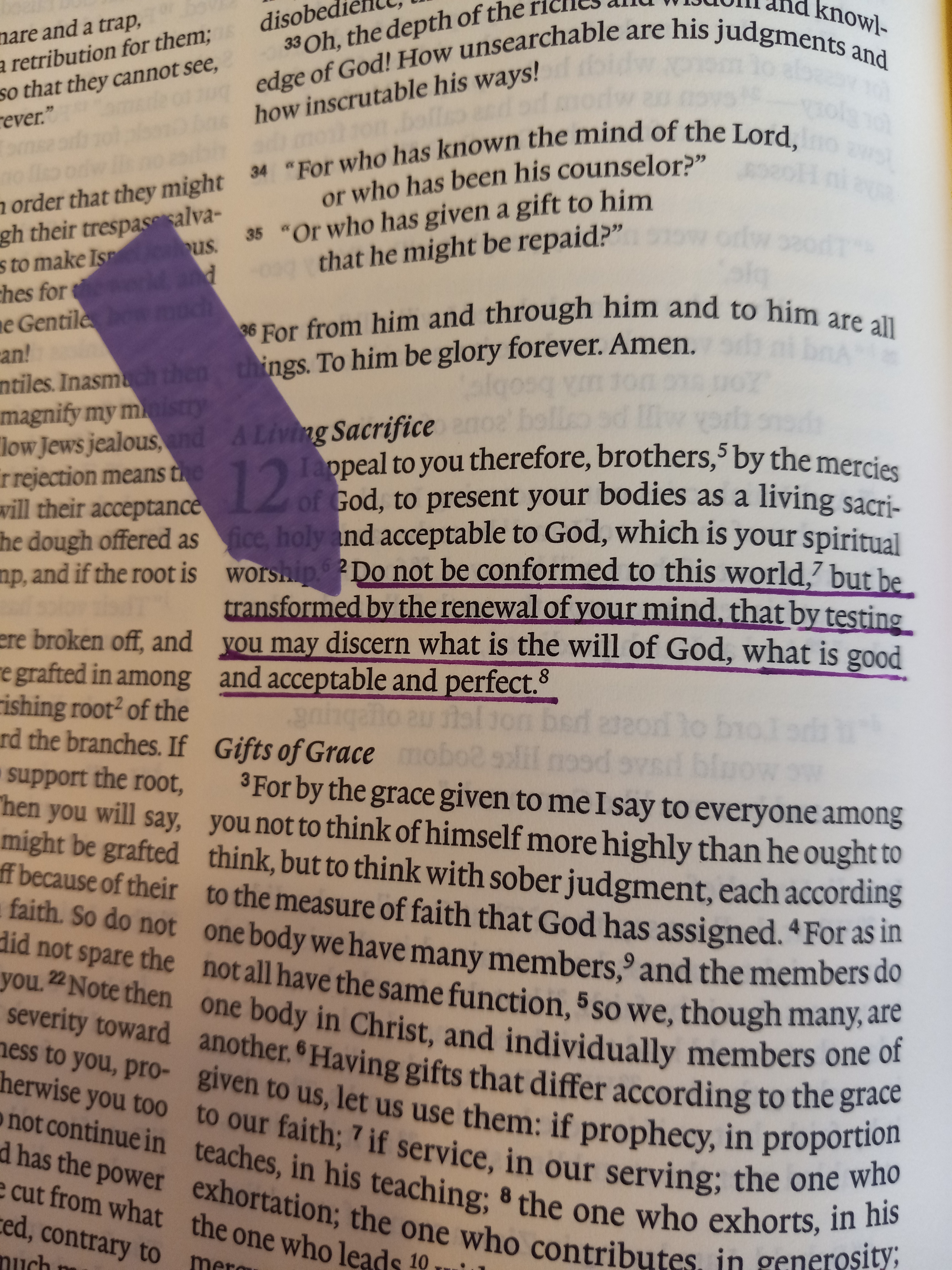 Pastor David Guzik, on the Enduring Word website, says, “But be transformed by the renewing of your mind: This is the opposite of being conformed to this world. The battle ground between conforming to the world and being transformed is within the mind of the believer. Christians must think differently.” The whole process begins in our minds. We must purposely determine in our minds to set our minds, fix our gaze, upon the things of God.