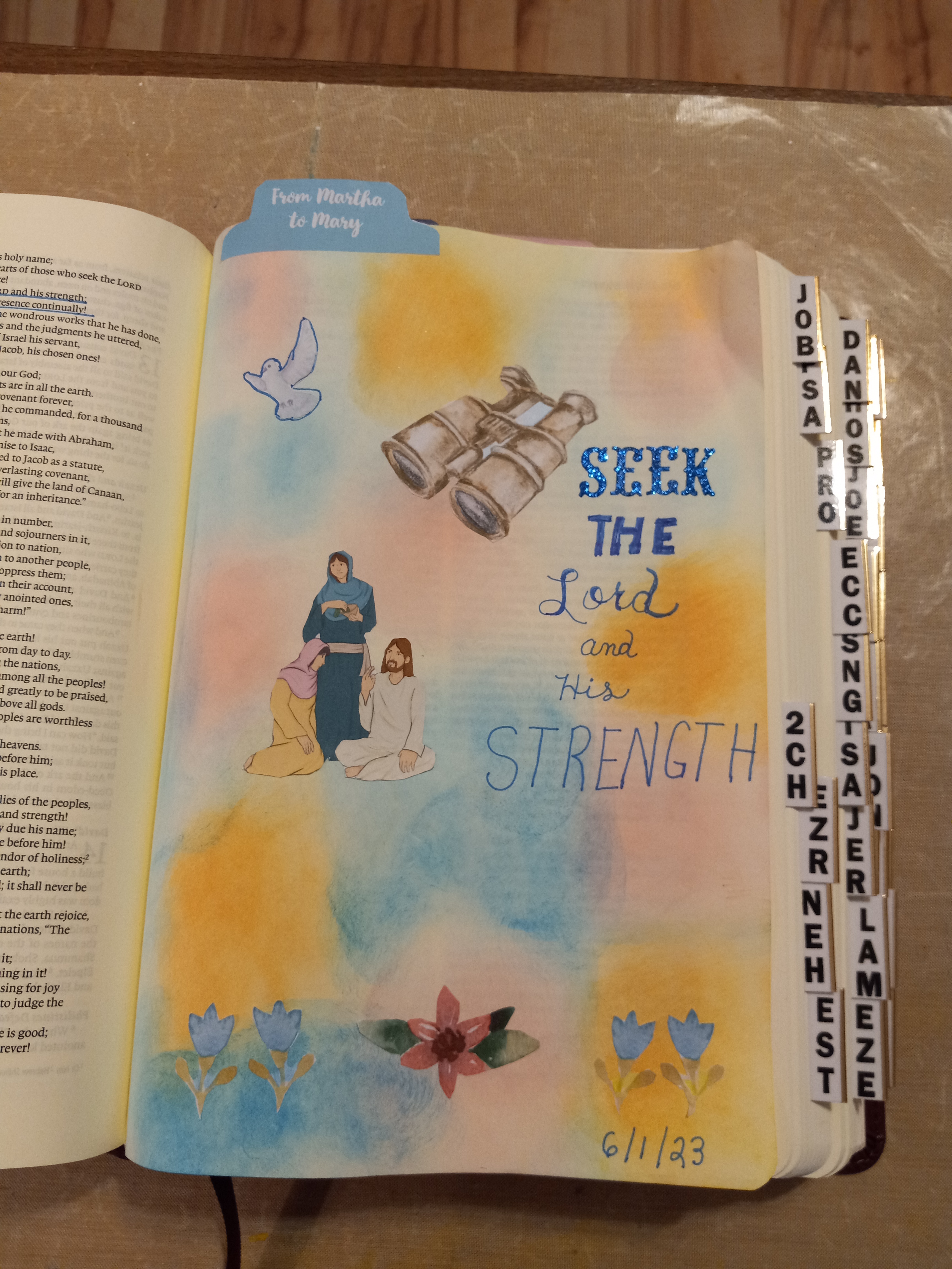 We will be looking at going from being a Martha to being a Mary this month. Jesus had come to their home, and Martha was so consumed with preparation and the peripheral things, that she missed out on what Jesus had for her. Mary sat at Jesus’ feet and soaked in everything He taught. She sought Him first above everything else. We will be looking at how to be like Mary. First, we are going to look at what we need to do to be able to accomplish that. Our Bible Journaling verse tells us, “Seek the Lord and his strength; seek his presence continually!” (1 Chronicles 16:11 ESV)