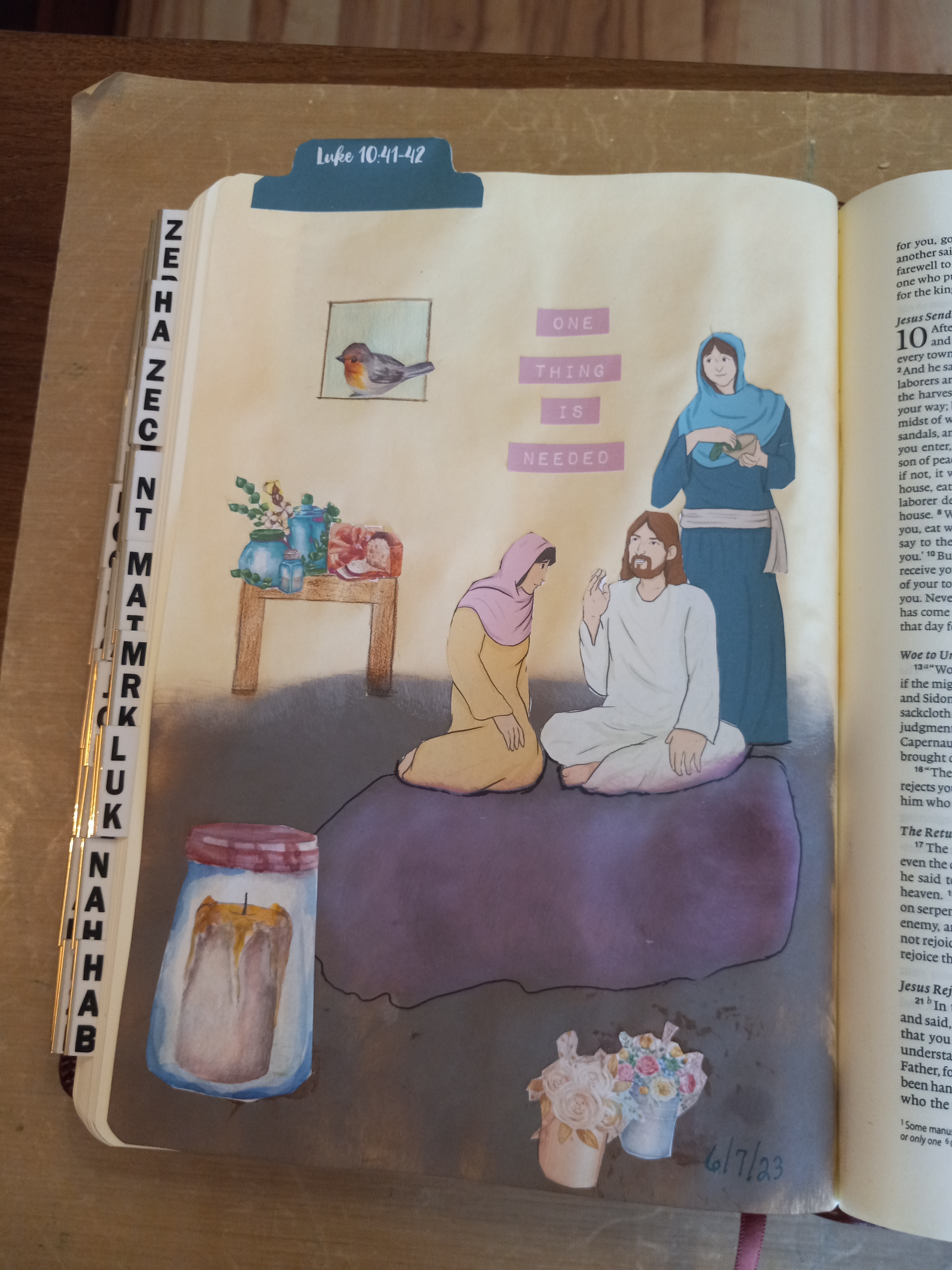 Jesus was at Martha, Mary, and Lazarus’ home in Bethany. Martha began serving everyone who was there and got so busy with her preparations that she became frustrated. Mary was seated at Jesus’ feet listening to His teachings. Martha began to complain to Jesus that Mary wasn’t helping her. Our Bible Journaling verse takes up the story from there, “But the Lord answered her, ‘Martha, Martha, you are anxious and troubled about many things, but one thing is necessary. Mary has chosen the good portion, which will not be taken away from her.’” (Luke 10:41-42 ESV)