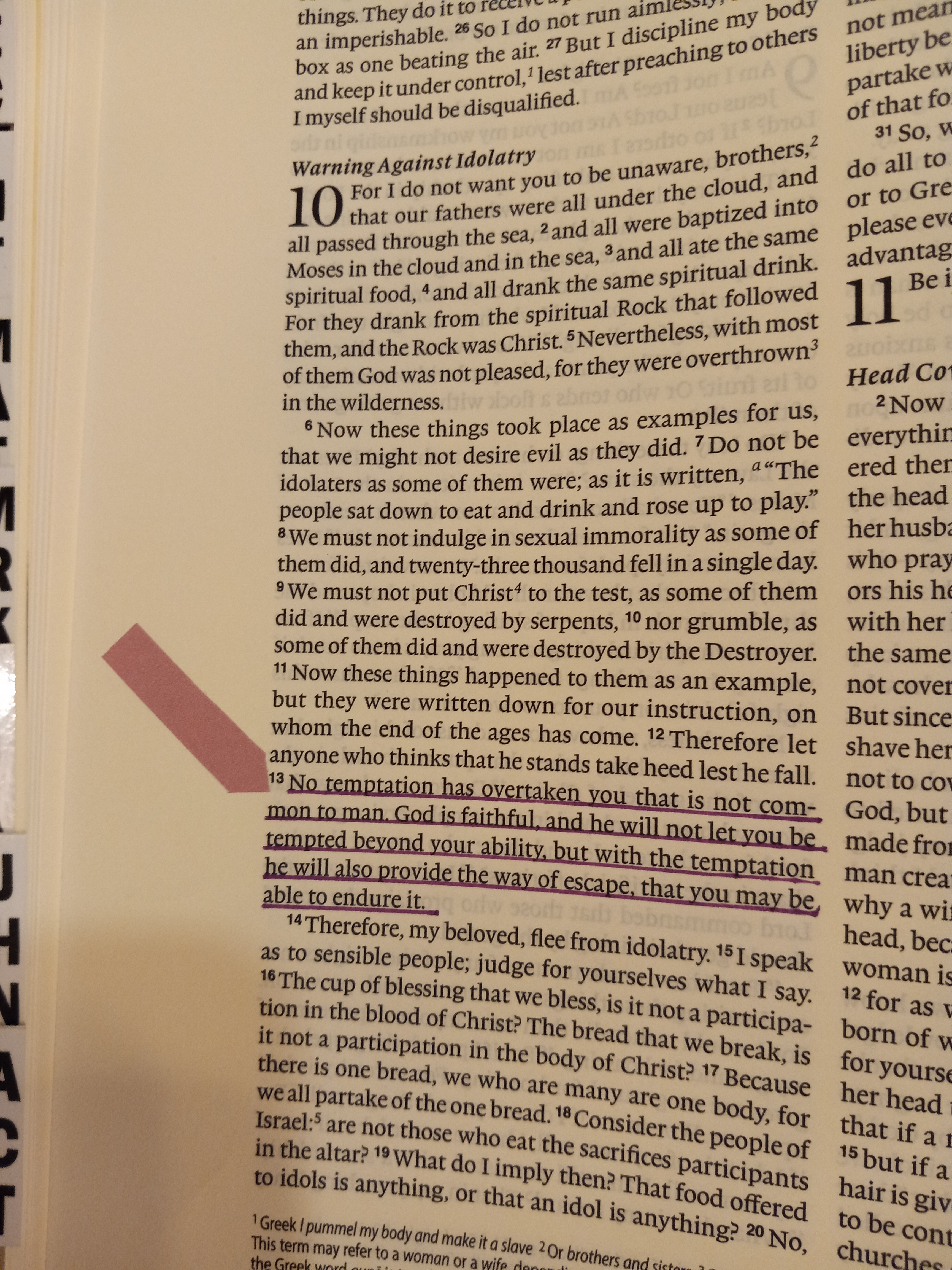 Paul tells us that we all have temptations. He says temptation is common to man. Our enemy, the Devil, uses temptation to get us to sin. Temptation isn’t the sin, acting on the temptation is the sin. The Corinthian church was dealing with all sorts of things…sexual immorality, gossiping, murmuring, and idolatry, just to name a few. They allowed these sins to distract them from following Jesus. Paul tells them that there is a way for them to escape these temptations. God provides a way for them to keep their focus on living Godly lives. He says that God always gives an avenue of escape from those things, that would turn our hearts away from God. Our job is to be vigilant, listen to what God is telling us, and run away from temptation.