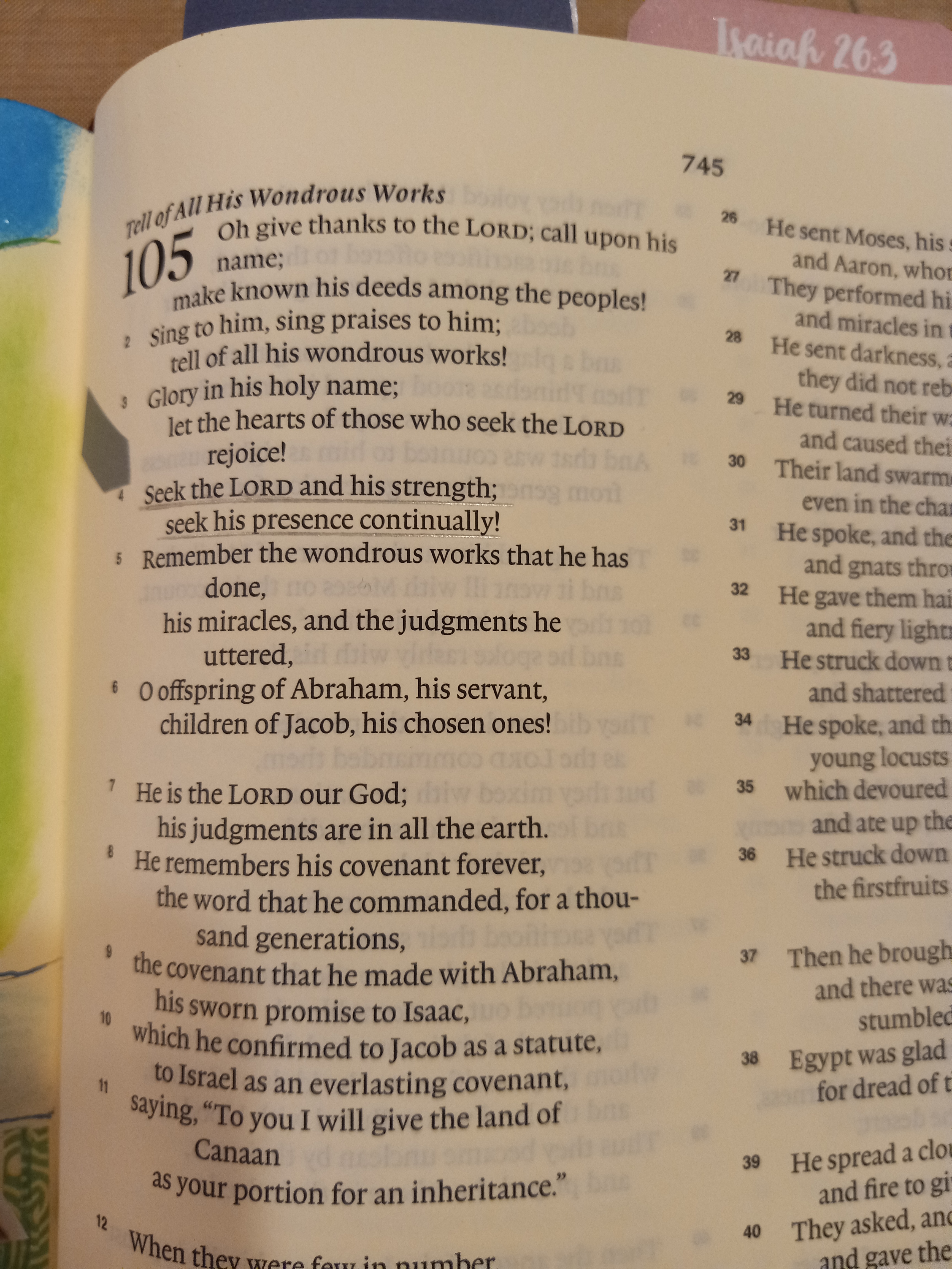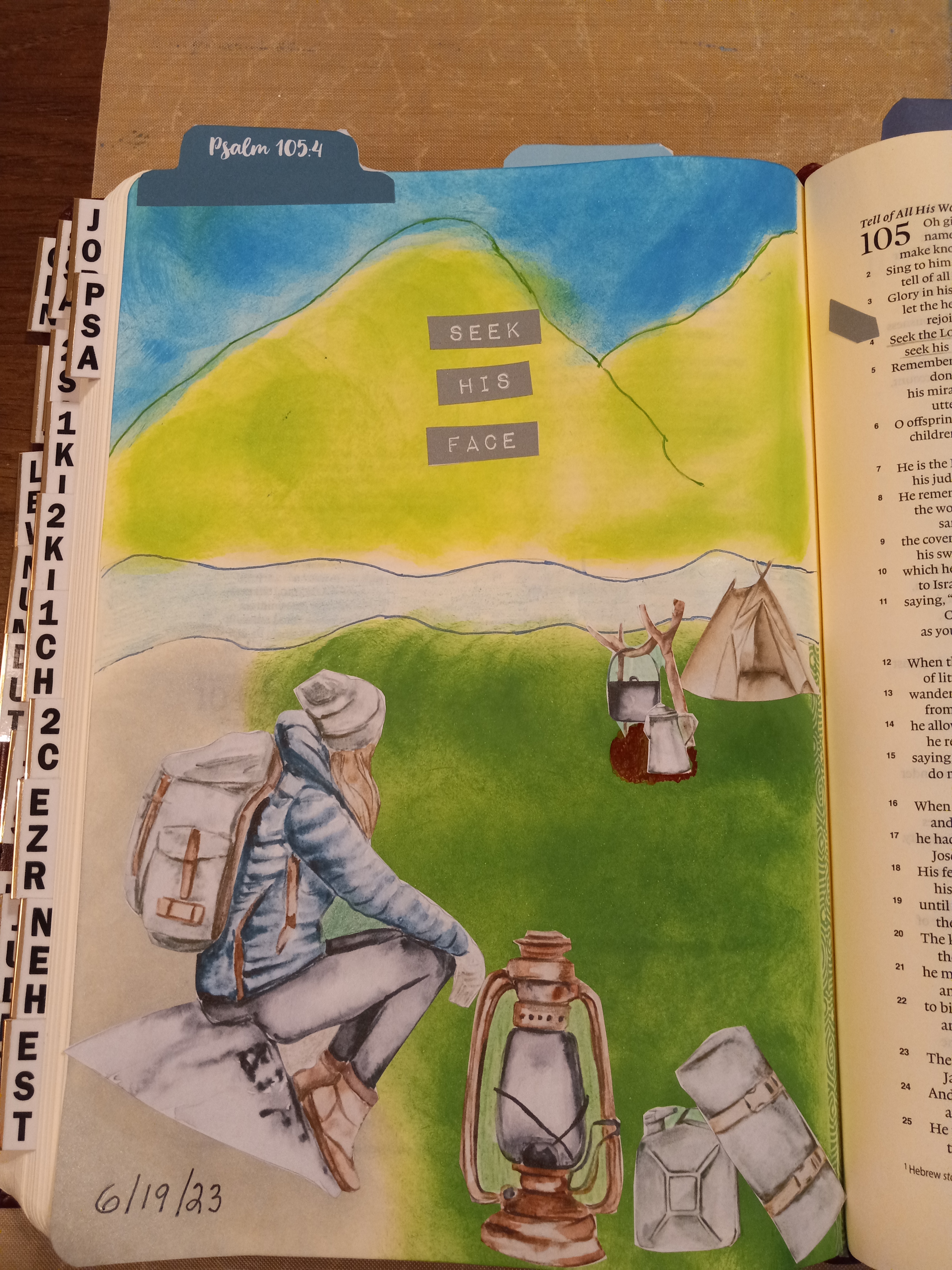 Luke 10:41-42 tells us that Mary chose the better way by not allowing distractions to keep her from focusing on what Jesus had for her to learn. She sat at His feet, soaking up everything He was teaching. She was following what our Bible Journaling verse today instructs, “Seek the Lord and his strength; seek his presence continually!” (Psalm 105:4 ESV) She was seeking the Lord, endeavoring to be as close to Him as she could be to gain strength from Him and be in His presence.