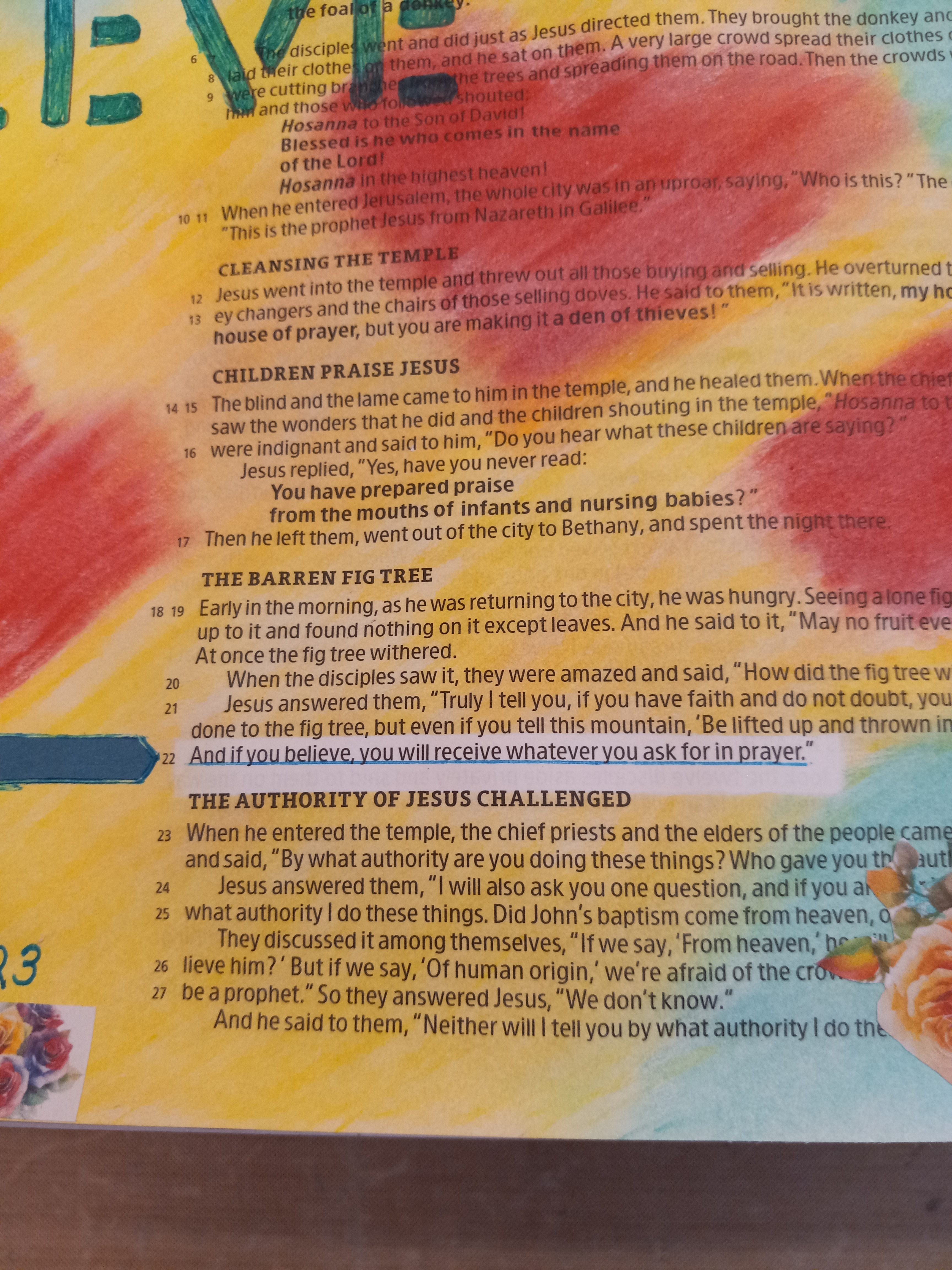Today we will look at the A in our acronym, PRAY. To review, P stands for praise, R is for repent, A is for ask, and Y is for yield. We often find ourselves at a point in our lives where we need to ask God for something, whether it’s for others or ourselves. Our Bible Journaling verse today says, “And if you believe, you will receive whatever you ask for in prayer.” As we look at this verse, it seems to me that a key component of asking is to believe we will receive what we are asking for. We must also ask in accordance with God’s will for our lives.