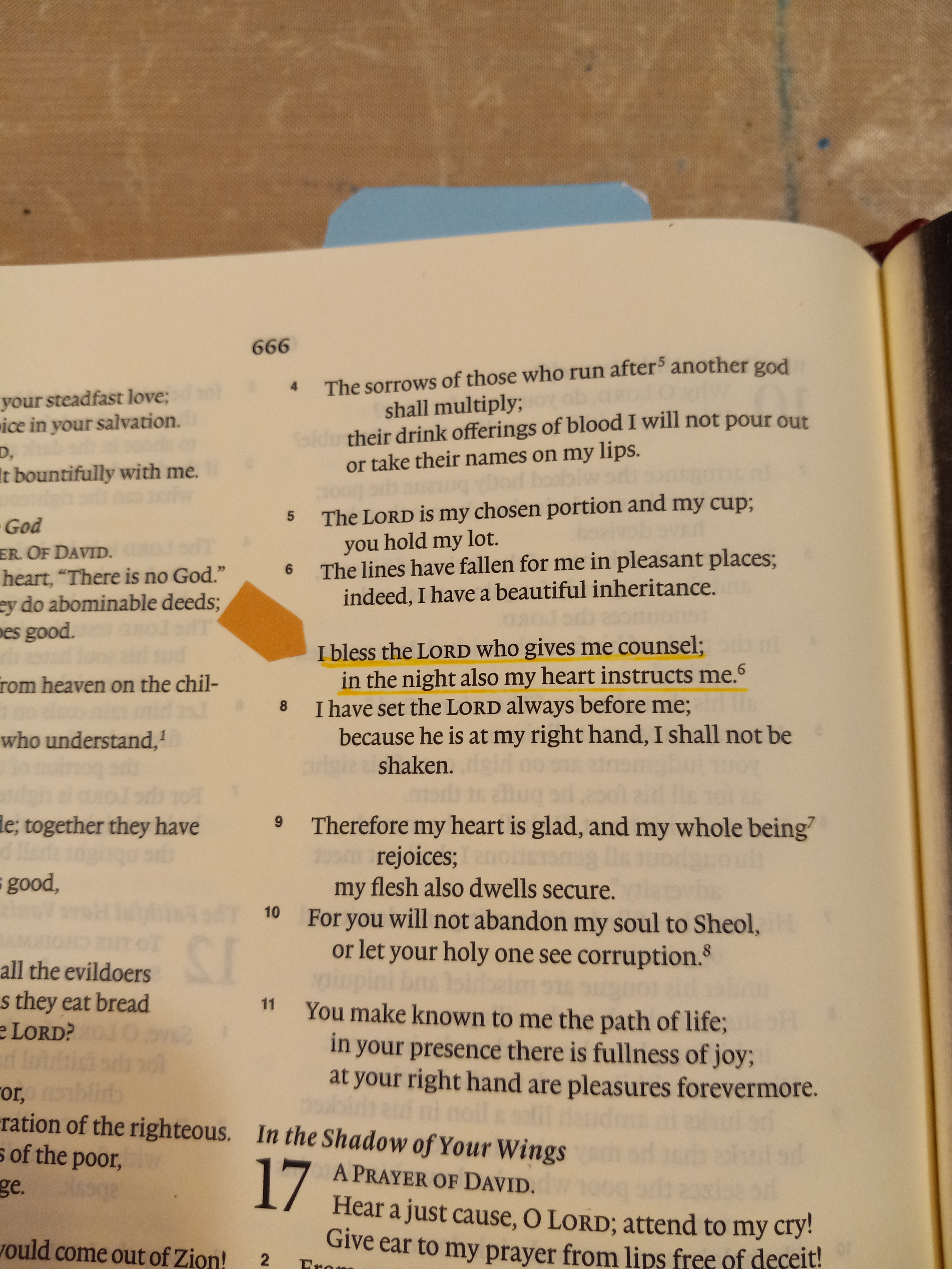 Are you the kind of person who likes to have every detail of something planned out? Do you plan every little thing on a trip, or do you throw caution to the wind and just head out and go to whatever sparks your interest? I must say, mostly I like to have things planned out, but I’m also up for an adventure occasionally and just go wherever and whenever something looks interesting. Walking the pathway God has planned for us can be like that. How do we react when things don’t go as we have planned, but God takes us on a detour? Do we freak out or do we just say, “OK God, whatever, let’s go.” In our Bible Journaling Scripture today, King David seems not the least bothered by God’s detours. “I bless the Lord who gives me counsel; in the night also my heart instructs me.” (Psalm 16:7 ESV) David knew from where his counsel came.