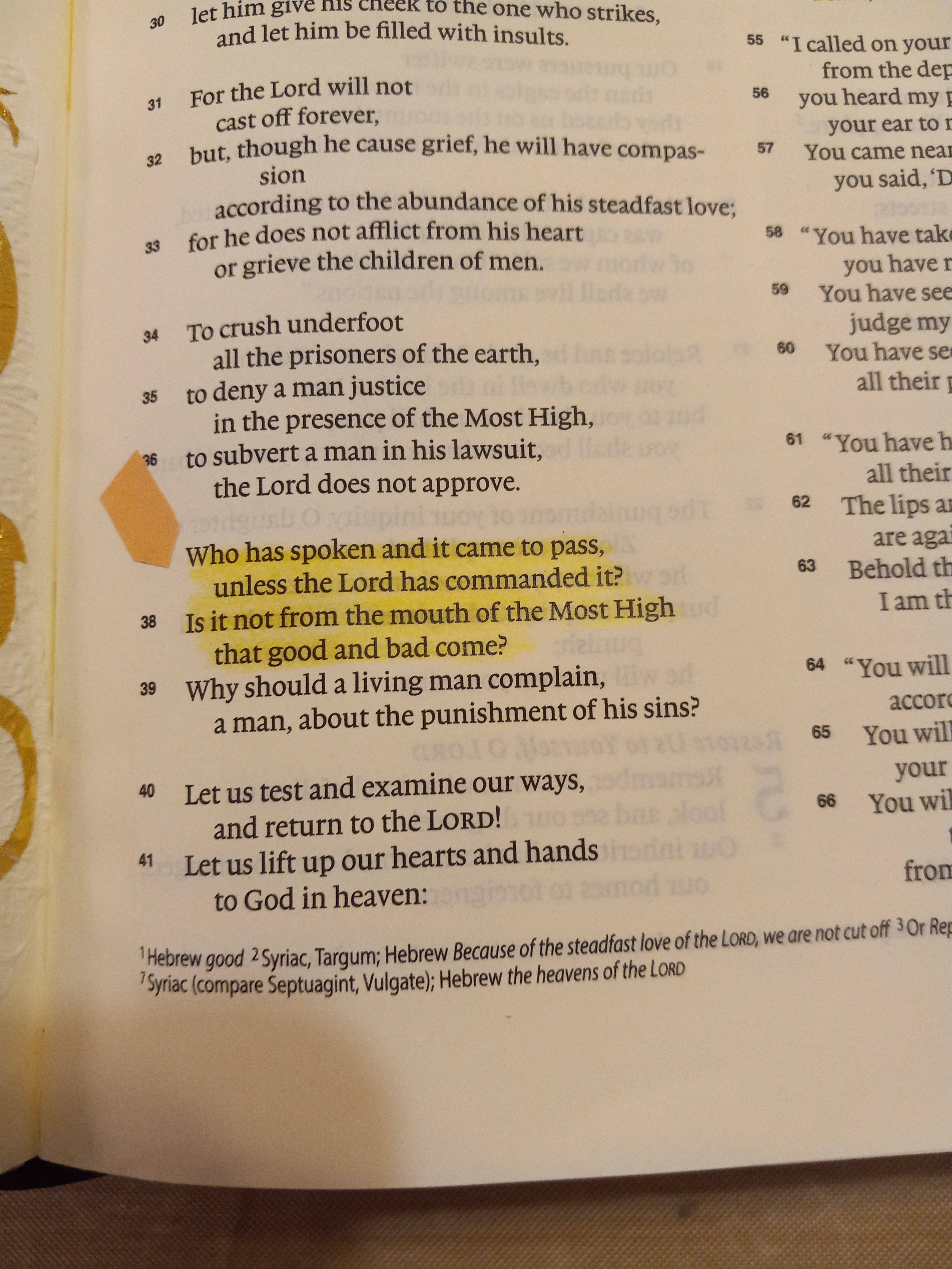 Sometimes when bad things happen to us it is because of our undoing, by sin in our lives. God uses even those times to help us. Lamentations 3:39 goes on to say, “Why should a living man complain, a man, about the punishment of his sins?” (ESV) In these instances, Jeremiah tells us what we are to do, “Let us search out and examine our ways, And turn back to the Lord.” (Lamentations 3:40 HCSB) When we find ourselves in the middle of a mess because of our sin, we shouldn’t complain to God about the mess we’re in, but we should confess our sin, and turn back to Him, thank Him for showing us where we went wrong, and follow His leading as we get back to walking the pathway He has planned for us.