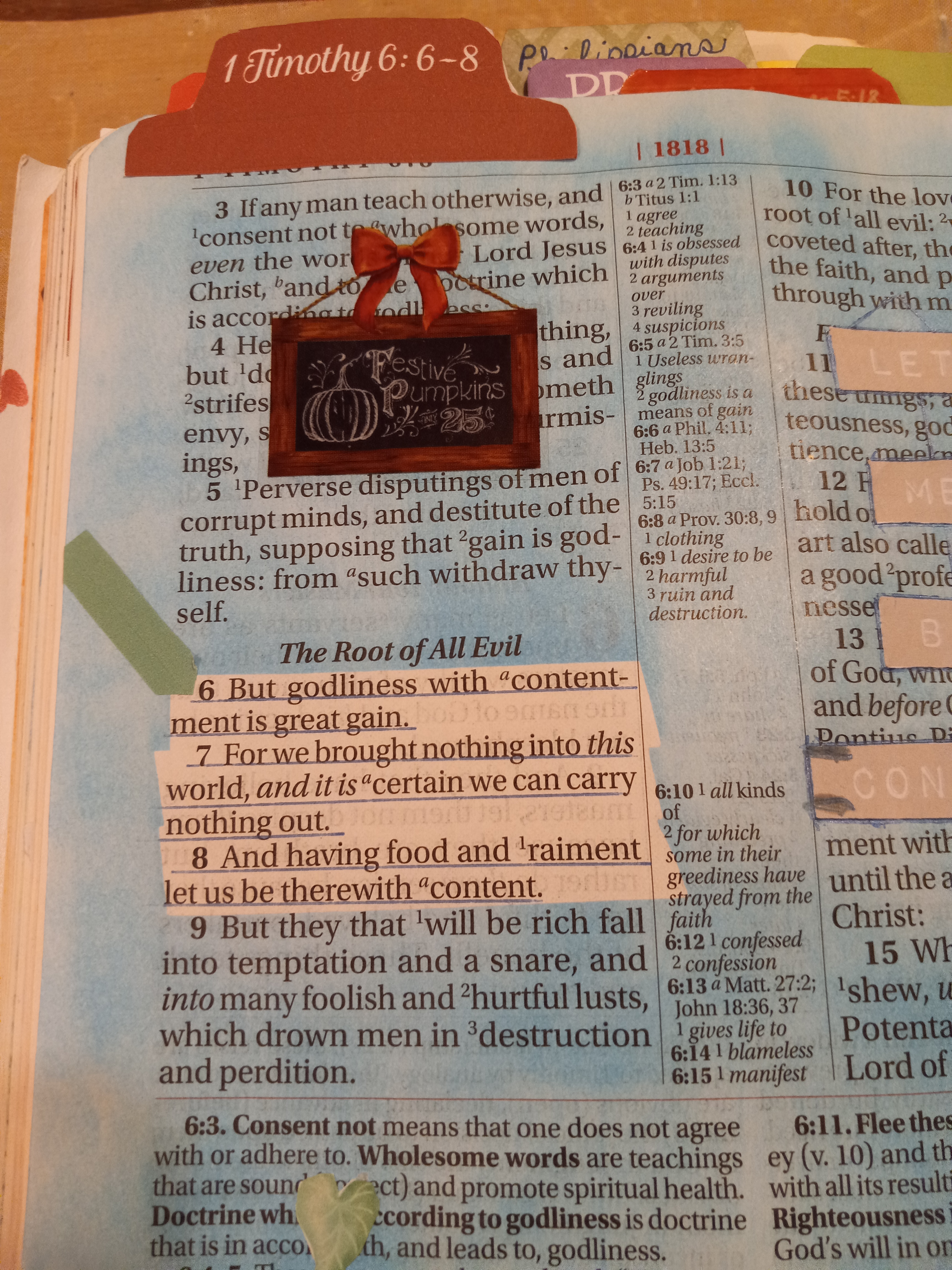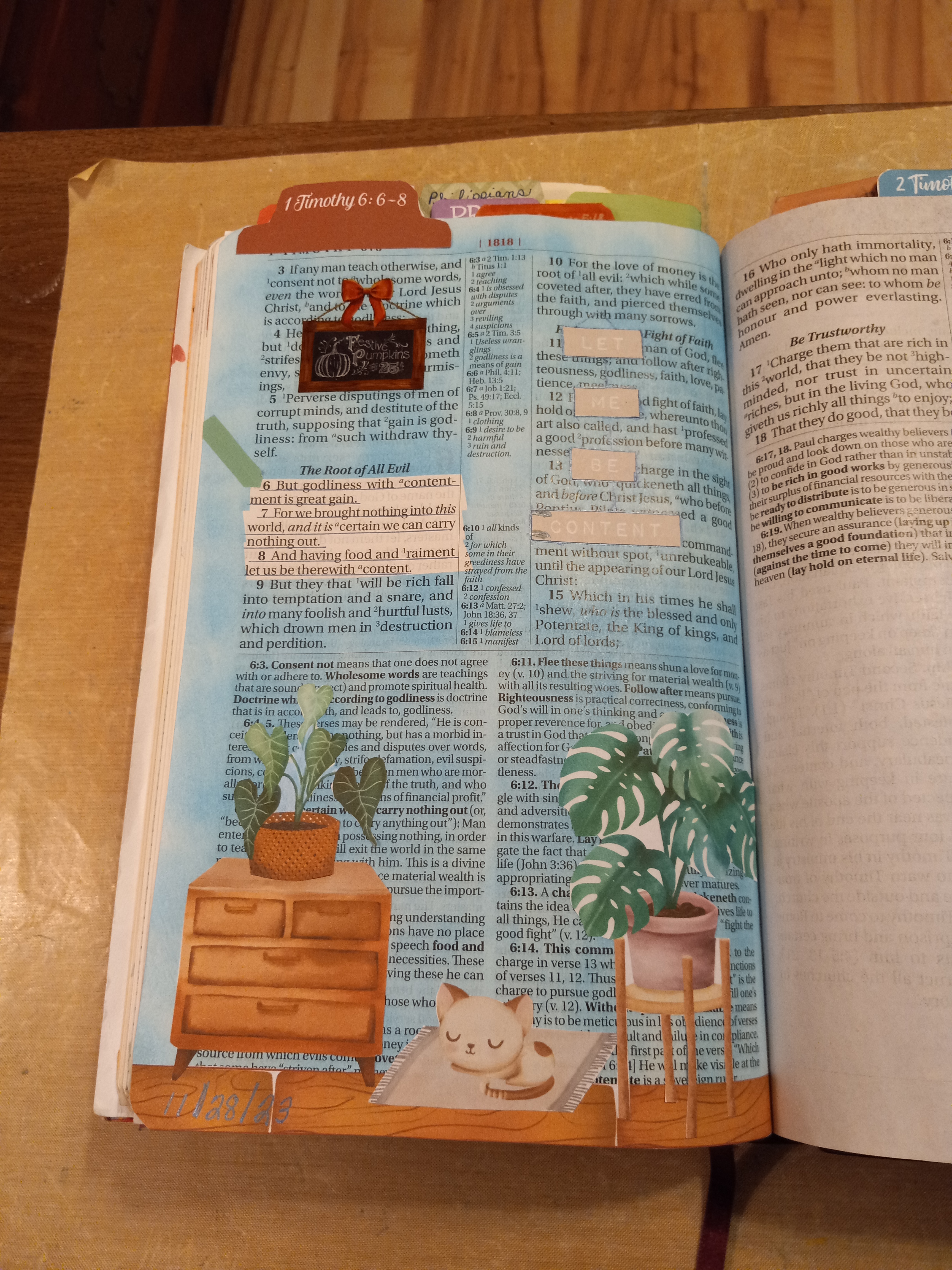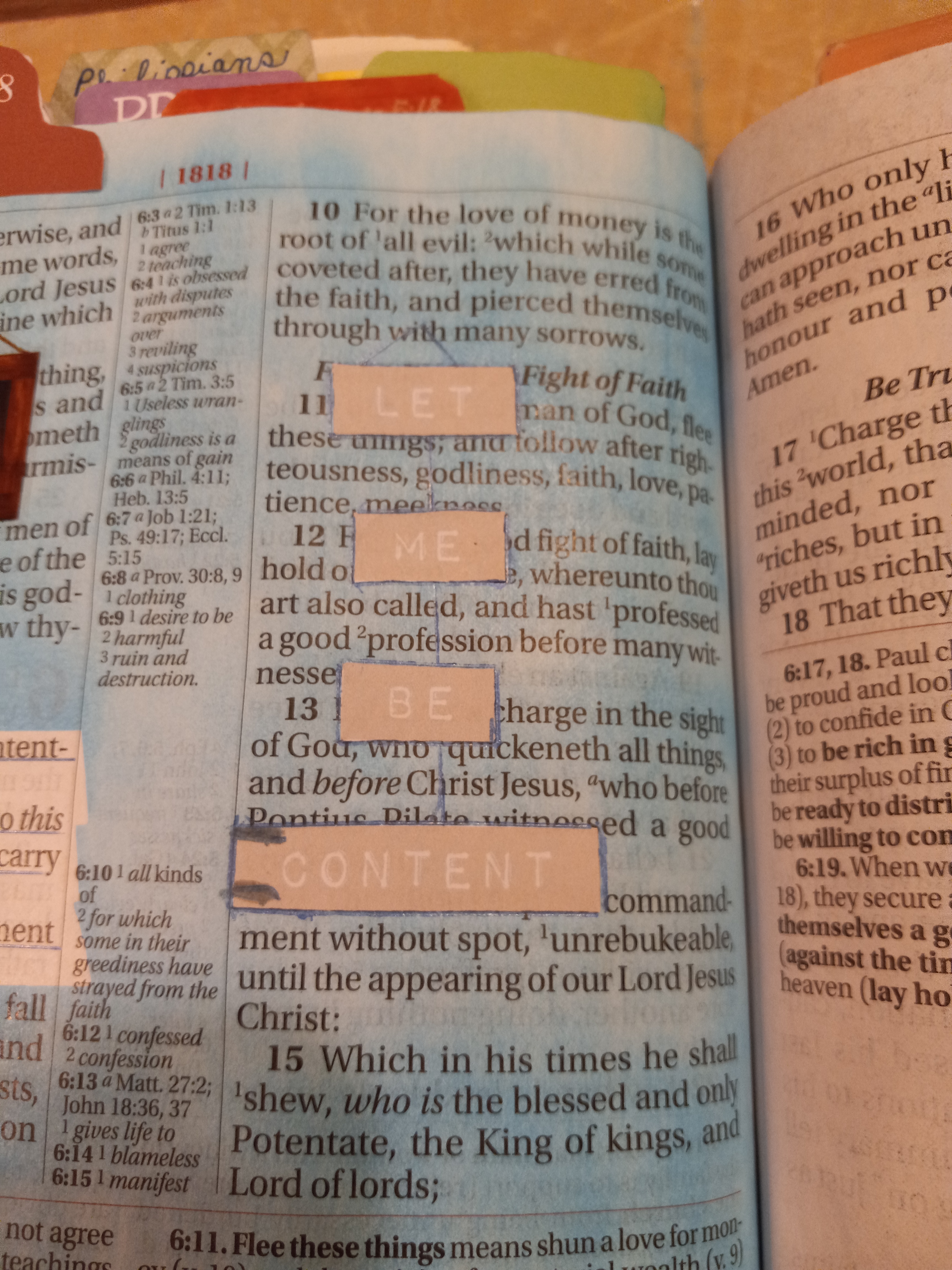 As we continue our discussion on gratitude, a main component of living a life of gratitude comes from contentment. Our Bible Journaling verse today says, “But godliness with contentment is great gain. For we brought nothing into this world, and it is certain we can carry nothing out. And having food and raiment let us be therewith content.” (1 Timothy 6:6-8 KJV) The Apostle Paul found the secret to true contentment, and that is being grateful for what God has provided. He knew that God would take care of him no matter in what circumstance he found himself.