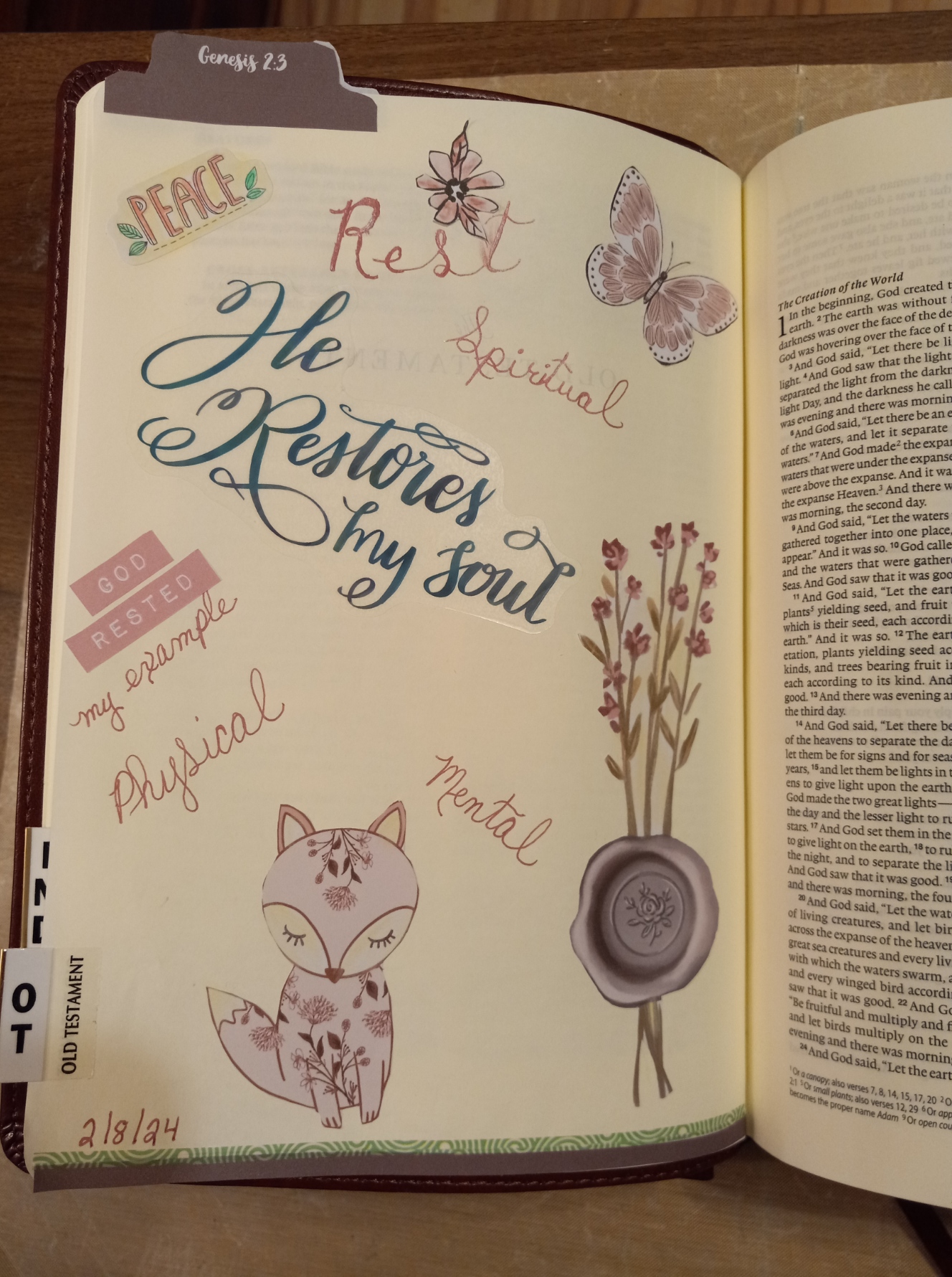 Today we are looking at the topic of resting. Did you know that God rested? Our Bible Journaling verse today tells us, “So God blessed the seventh day and made it holy, because on it God rested from all his work that he had done in creation.” (Genesis 2:3 ESV) God had been busy creating this beautiful world we live in. He created everything we see in six days, but on the seventh day, He rested. Did He need to rest like you and I do when we’ve done a lot of demanding work? No, I believe that He rested to give us an example of what we are to do. Resting is not only good for our physical bodies, but it is also good for our Spiritual body.