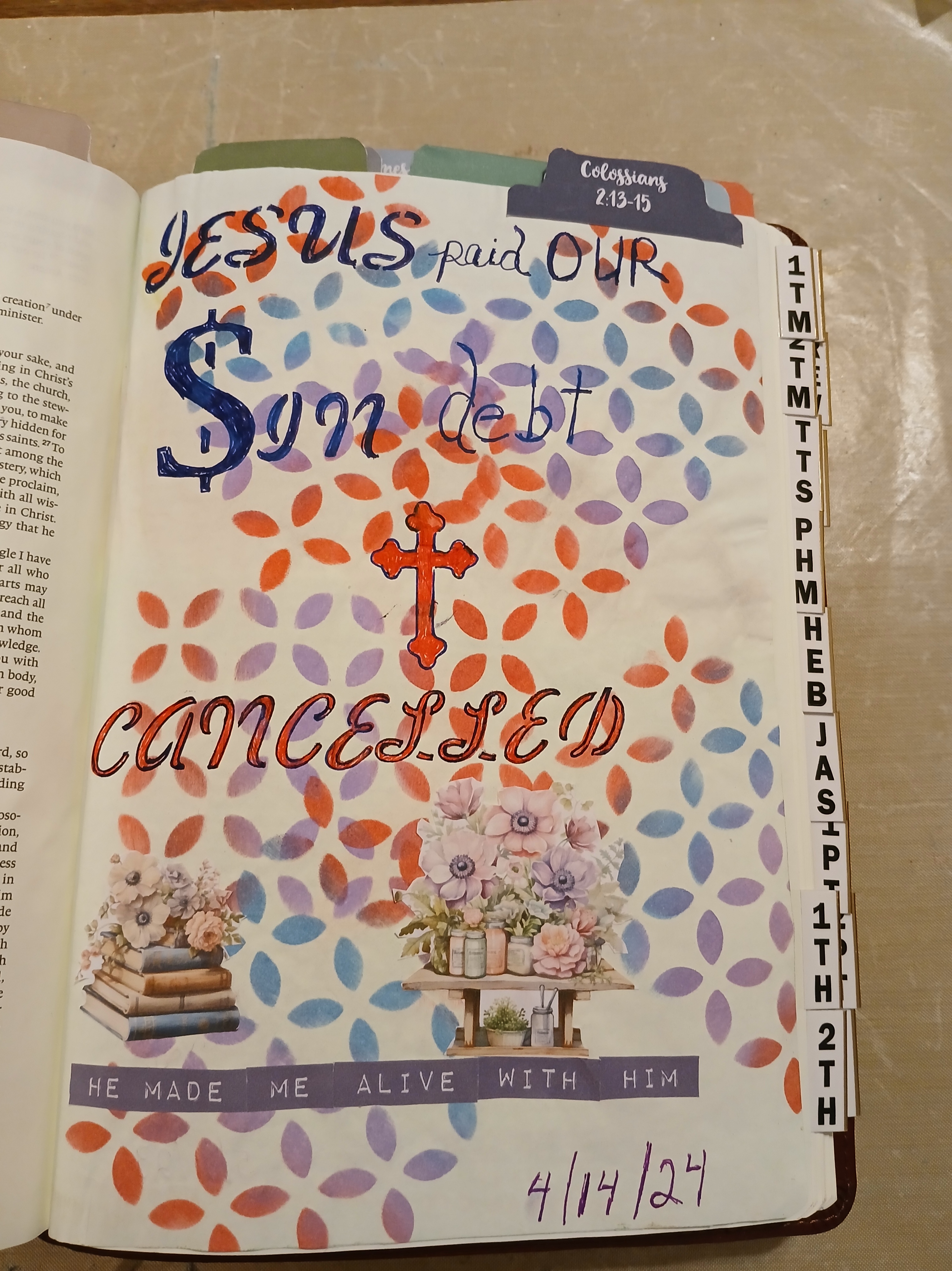 Have you ever had the opportunity to have a debt canceled? I am sure if you have, you found a sense of relief, knowing you did not have to pay that debt. As Believers, we have a debt that has been paid, far more than any financial debt we may have. The debt of our sins was paid by Jesus on the Cross as payment for our sin debt. Our Bible Journaling Scripture today says, “And you who were dead in your trespasses and the uncircumcision of your flesh, God made alive together with him, having forgiven us all our trespasses, by canceling the record of debt that stood against us with its legal demands. This he set aside, nailing it to the cross. He disarmed the rulers and authorities and put them to open shame, by triumphing over them in him.” (Colossians 2:13-15 ESV)