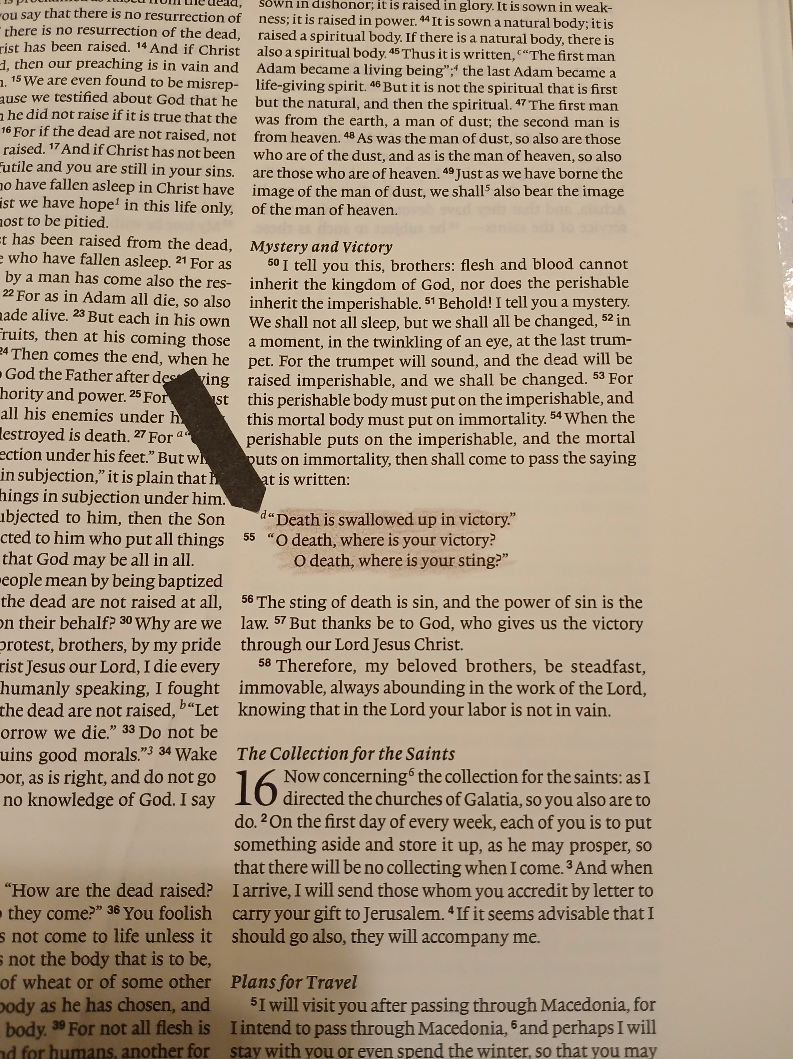 Physical death is something we don’t like to think about. It means the end of physical life, and it always leaves us feeling as if a part of us is missing, especially if the person who has passed away is a family member. For those who have not accepted Jesus as their personal Lord and Savior, it can leave a feeling of despair and loss, that we’ll never see that person again. However, for those who have asked Jesus to be their Lord and Savior, it isn’t goodbye forever, it’s “I’ll see you later.” Why? Because we know that we will see that person again in Heaven. The Apostle Paul explained that we have this hope because of Jesus’ death on the cross and resurrection from the dead. He tells us, “When the perishable puts on the imperishable, and the mortal puts on immortality, then shall come to pass the saying that is written: ‘Death is swallowed up in victory.’ ‘O death, where is your victory? O death, where is your sting?’ The sting of death is sin, and the power of sin is the law. But thanks be to God, who gives us the victory through our Lord Jesus Christ.” ( 1 Corinthians 15:54b-27 ESV) When Jesus died and rose again, He canceled Eternal death, sin, and the grave.