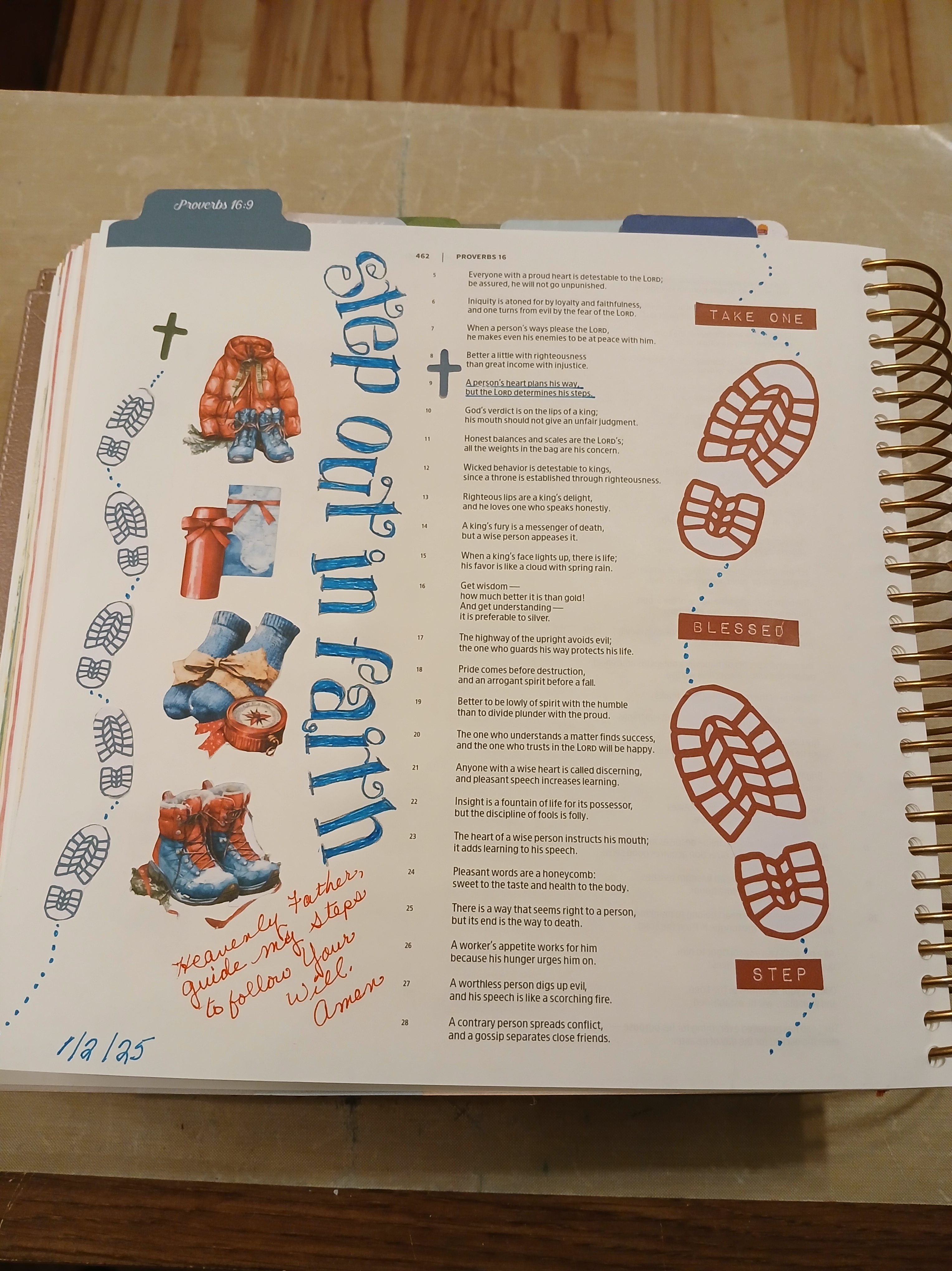 We are at the beginning of a new year, and we have a clean slate in front of us. Many people make New Year’s Resolutions to chart a new course for their lives. As human beings, we plan our lives out, but I would venture to say that many don’t realize that with all their planning, God is the One who ultimately directs their paths. Today’s Bible Journaling verse says, “A person’s heart plans his way, but the Lord determines his steps.” (Proverbs 16:9 CSB) Sometimes, God takes us on a different path than we have been traversing. That can be daunting, especially if we don’t know where God is leading us.