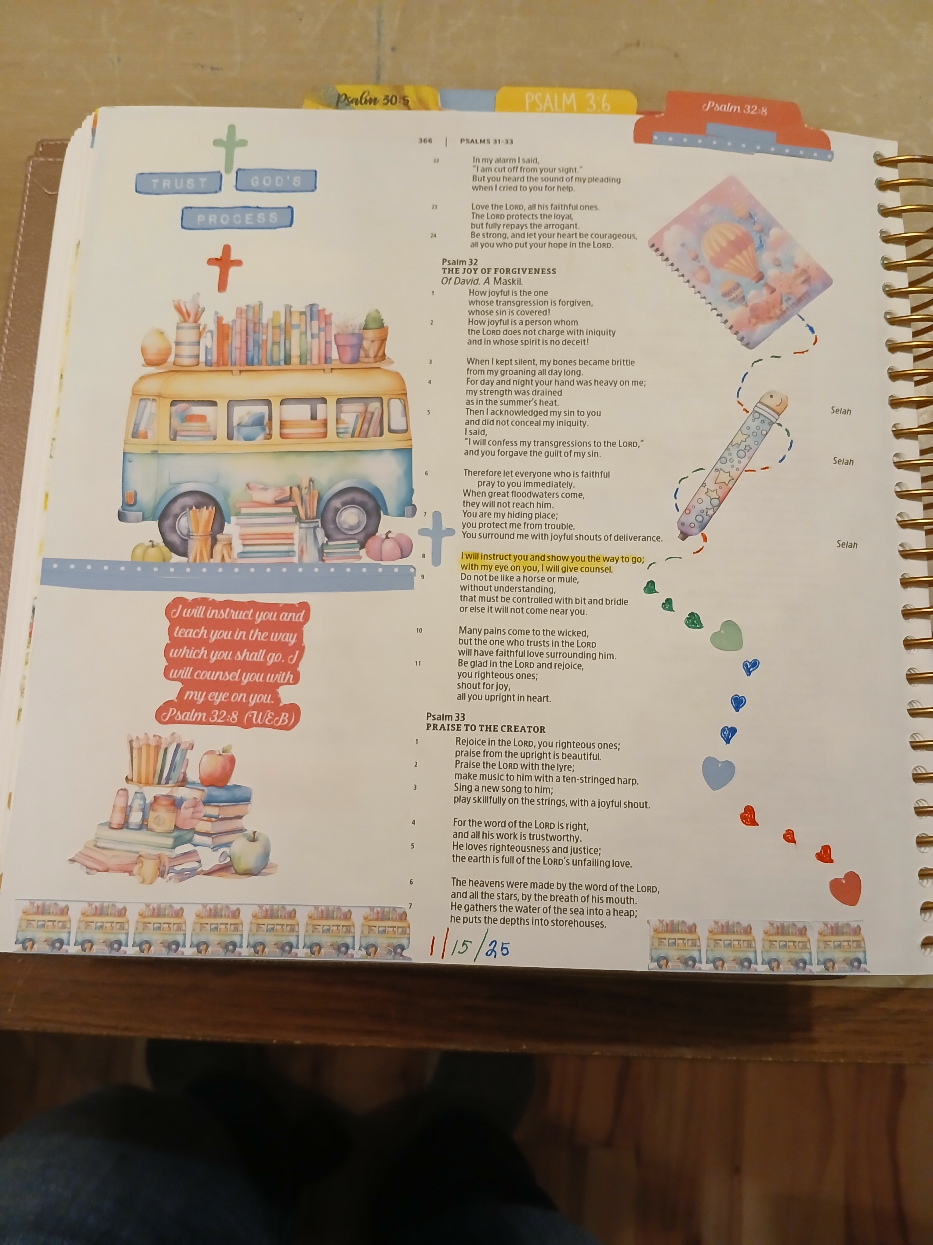 There are times in our lives when we find ourselves looking for direction. Life has a way of setting us in situations that are just too difficult to navigate on our own. However, God has an answer to the question, “What do I do now?” In today’s Bible Journaling Scripture, He says, “I will instruct you and show you the way to go; with my eye on you, I will give counsel.” (Psalm 32:8 CSB)